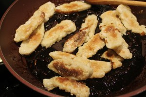 In a frying pan, shallow fry the seitan until they are golden on eat side.
