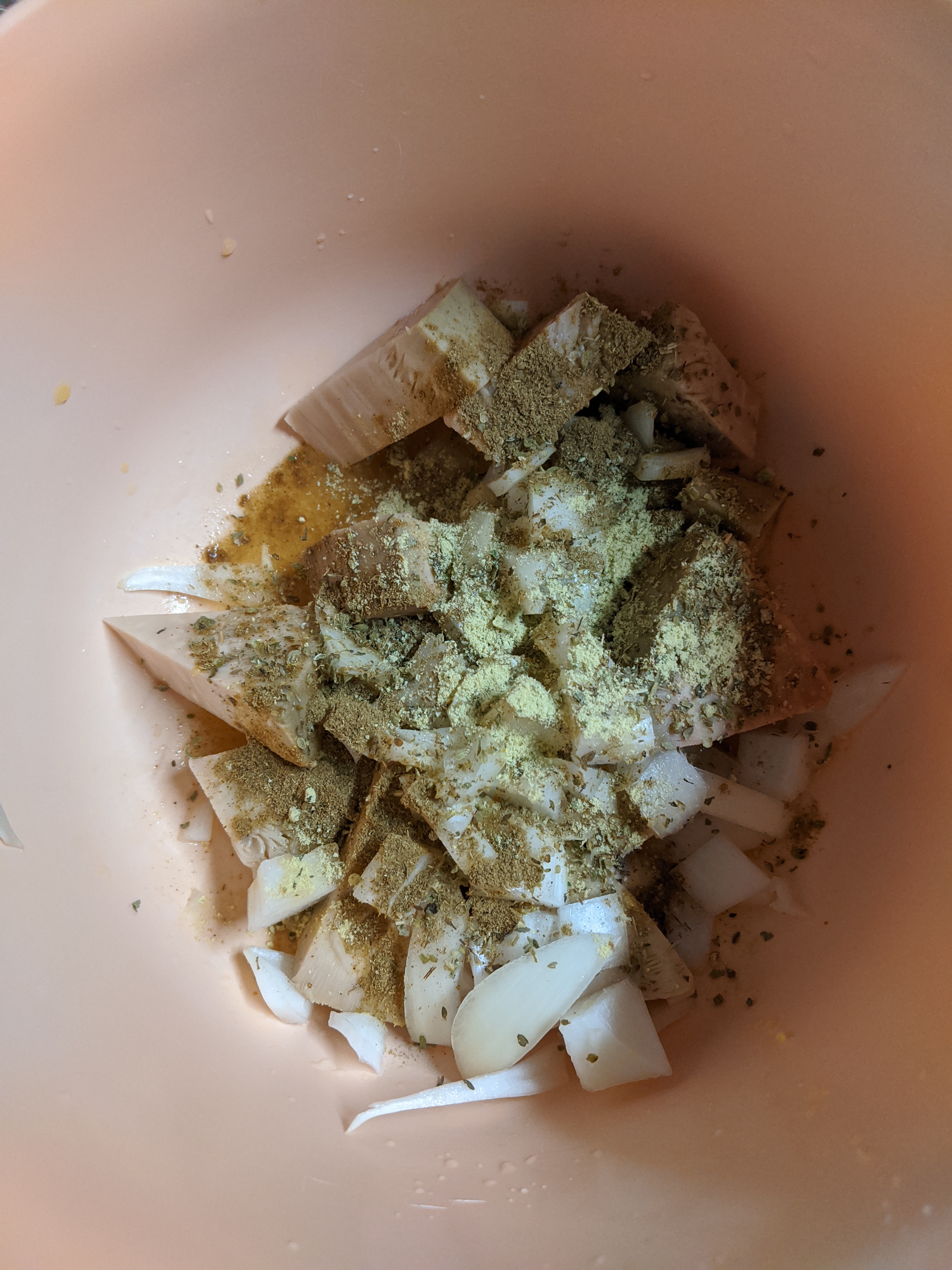 To make the jackfruit carnitas, you will need to add some of the flavours. Prepare the ingredients and place them into a bowl. Drain the jackfruit and remove any large seeds. Add 1/4 cup onion, 1 tsp lime juice, juice from 1/2 orange, 1 tsp cumin, 1 tsp oregano, and 2 tbsp instant vegetable stock. Let this marinate for at least 30 minutes.