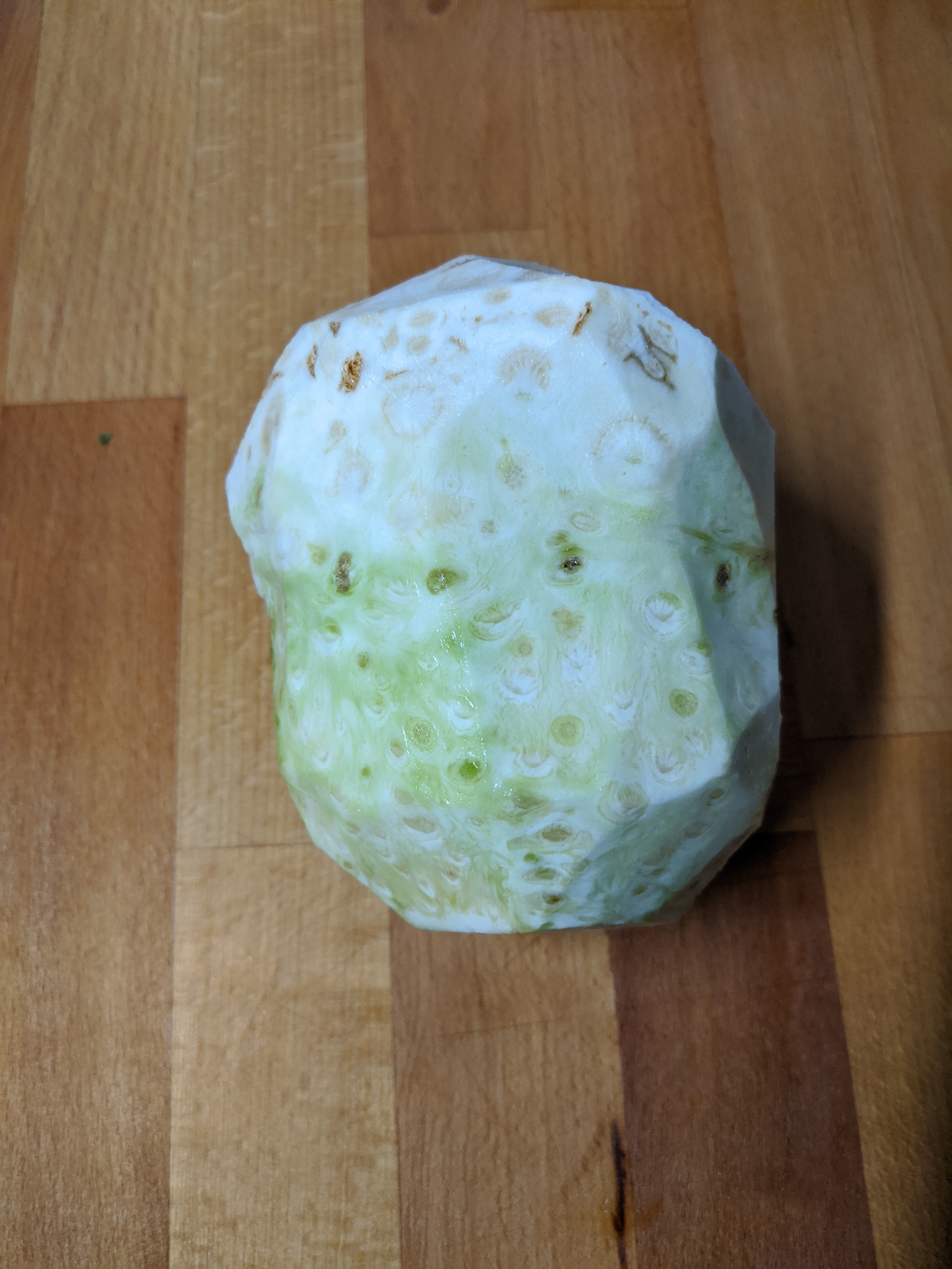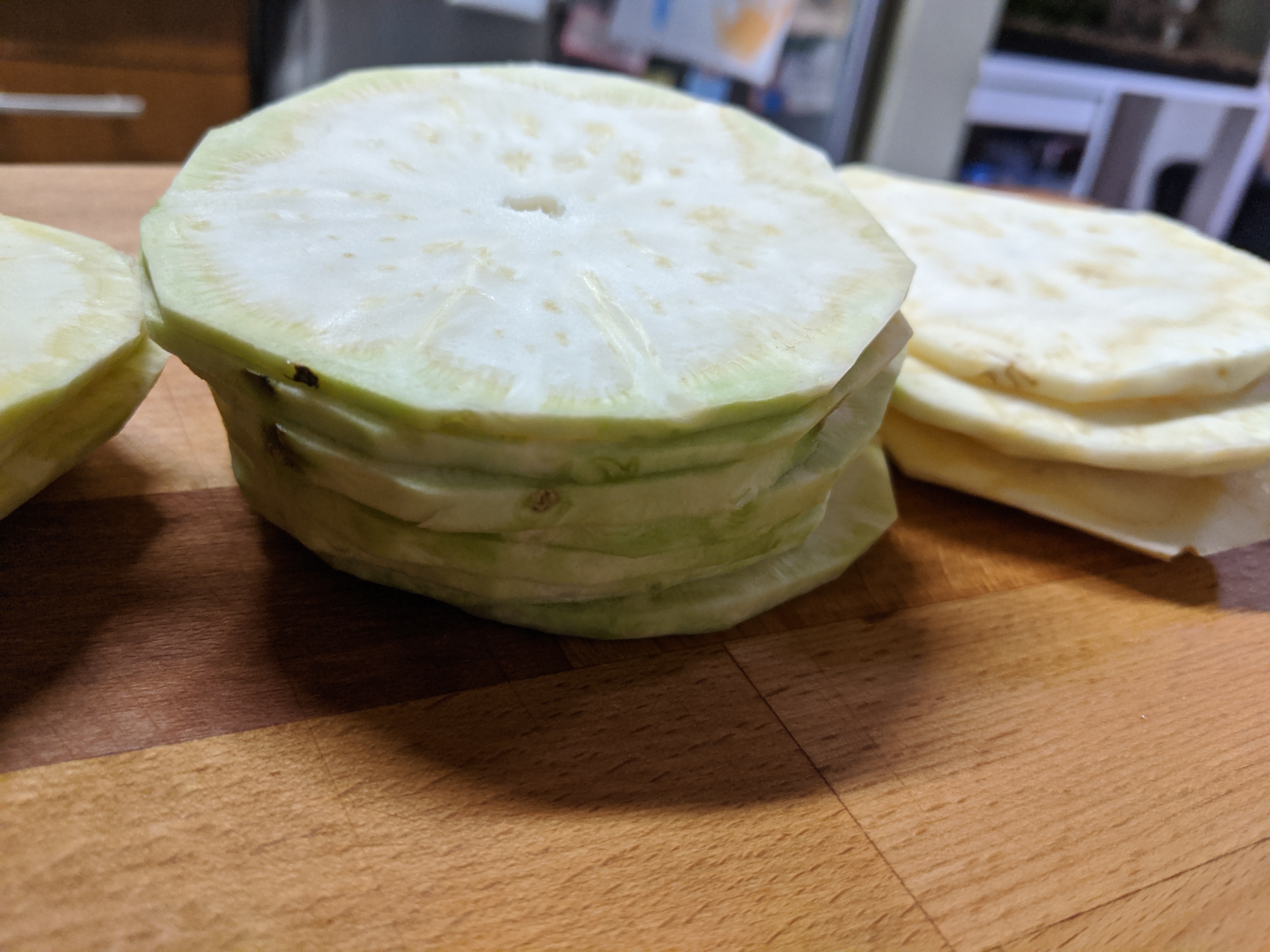 Carnitas is not complete with some form of wrap. Instead of a soft chewy flour wrap, I decided to make a celery root tortilla. This is gluten free and delicious. To make the wraps you will need to prepare a celery root. Peel the celery root and carefully slice it into thin pieces.