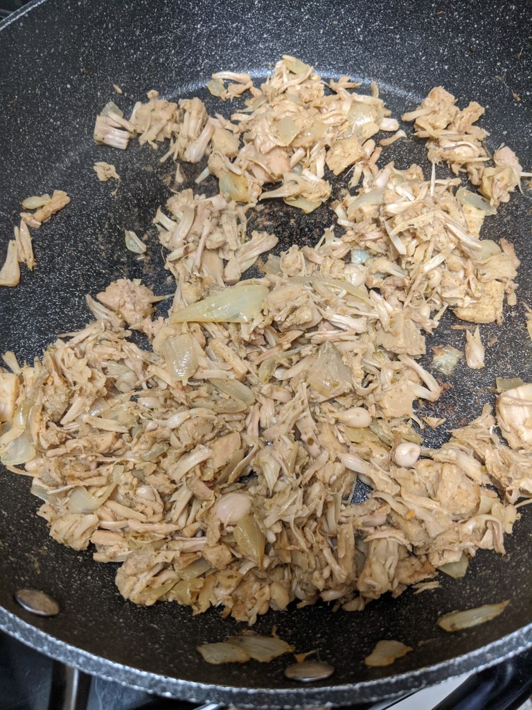 After marinating, place everything into a frying pan and cook on medium. As the jack fruit cooks, you will be able to shred them into pieces that looks like shredded pork. Cook until the jack fruit browns. Give it a taste and adjust some of the flavours. Add more vegetable stock as needed.