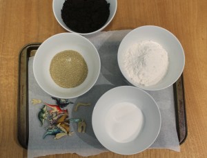 For this recipe, you need sand, coffee grinds, flour, salt and water. I set out the ingredients and let my son mix them all up.