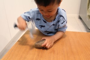 Combine all dry ingredients together. Slowly add some water. Make sure that the dough forms together but is not too sticky. Wrap each dinosaur in dough. Make sure each one is covered. The larger the dinosaur, the more dough you need. I think I was able to cover 8 dinosaurs. Allow to dry for a couple days, flipping over once. Even after a couple days, these eggs did not dry fully. But they still worked. Break the dry eggs with a hammer.