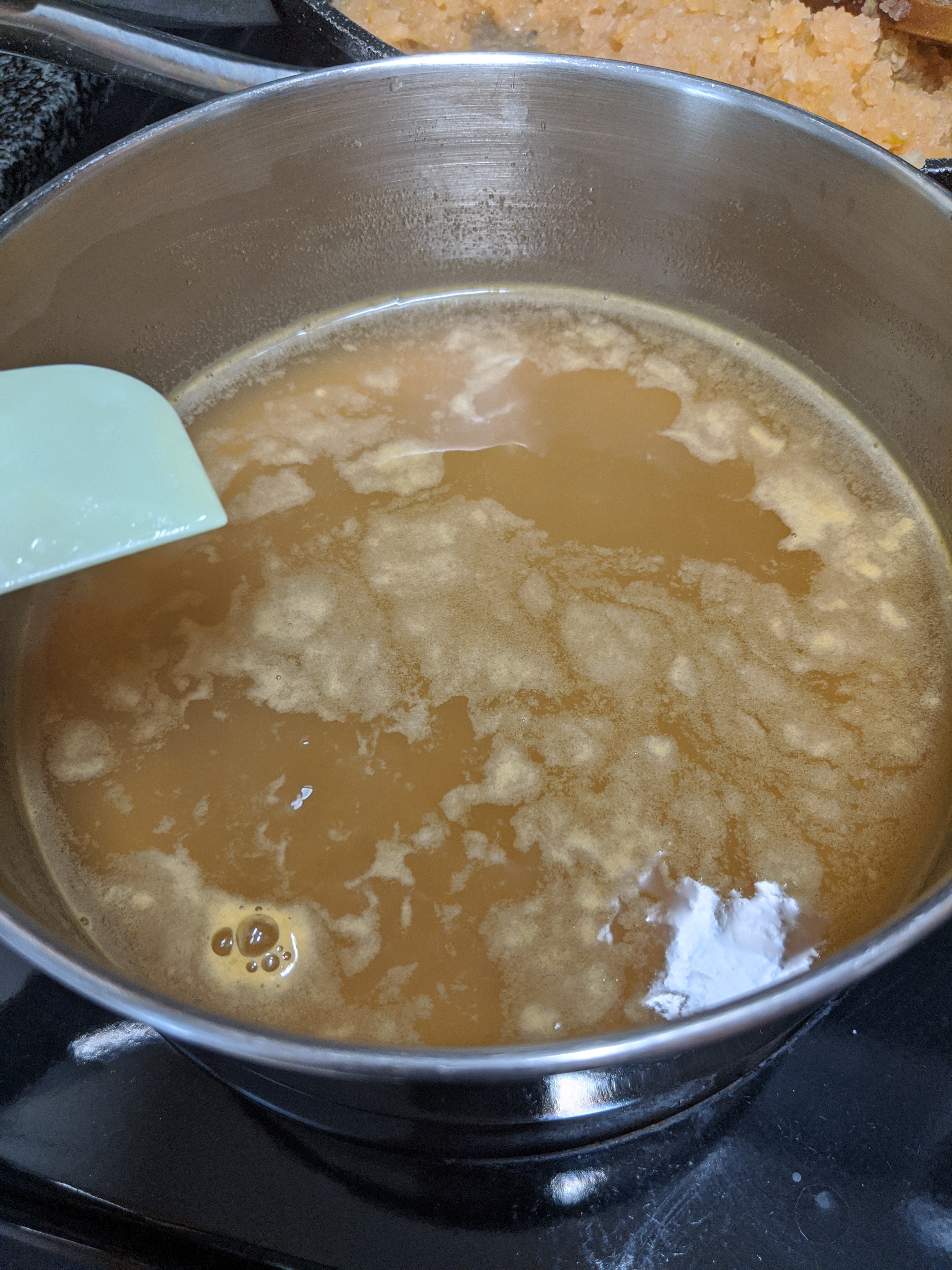 - In a sauce pan, add the juice, sugar and lemon juice.