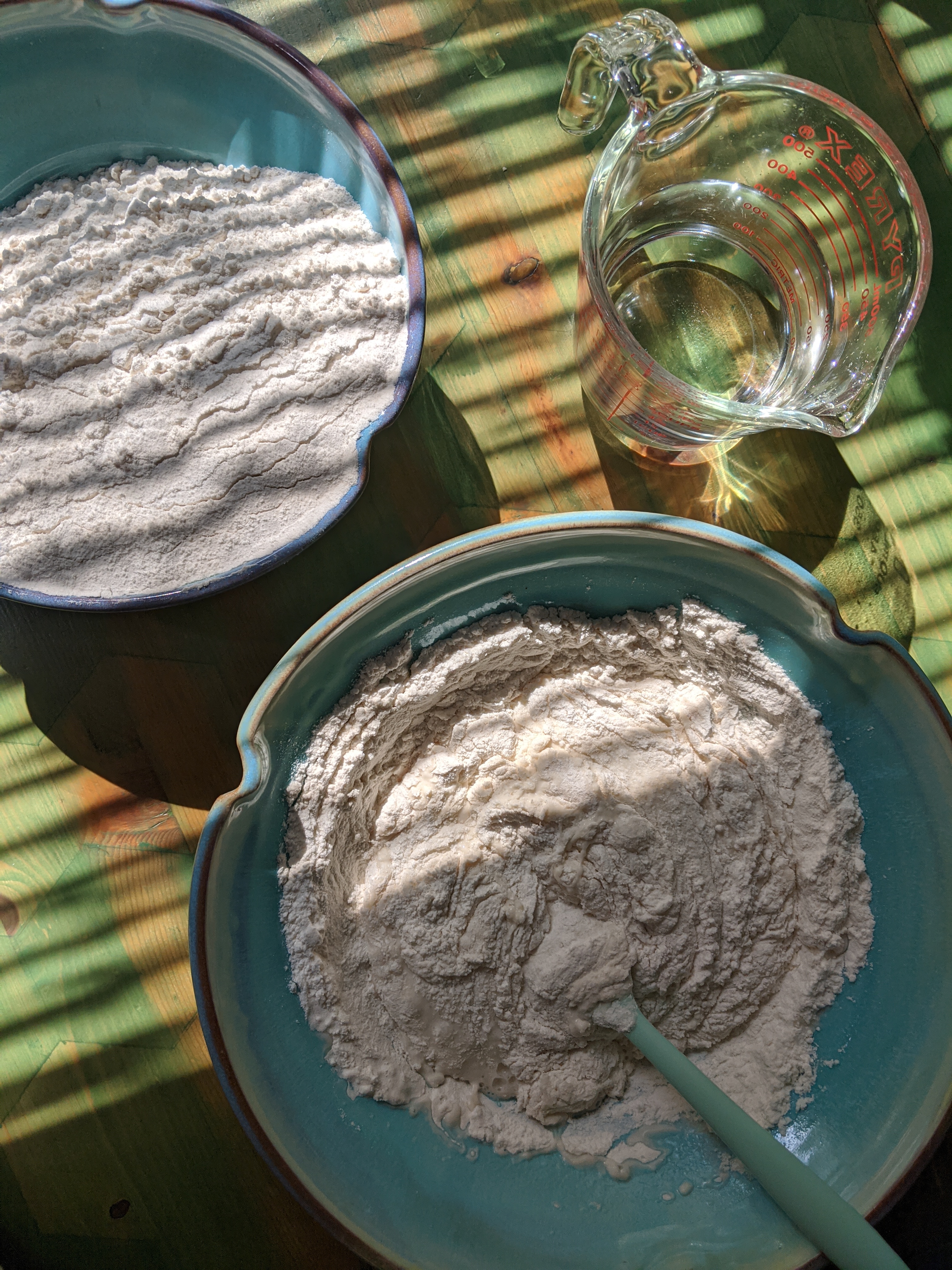- Mix starter, salt, and water together until combined. Slowly add flour until incorporated.