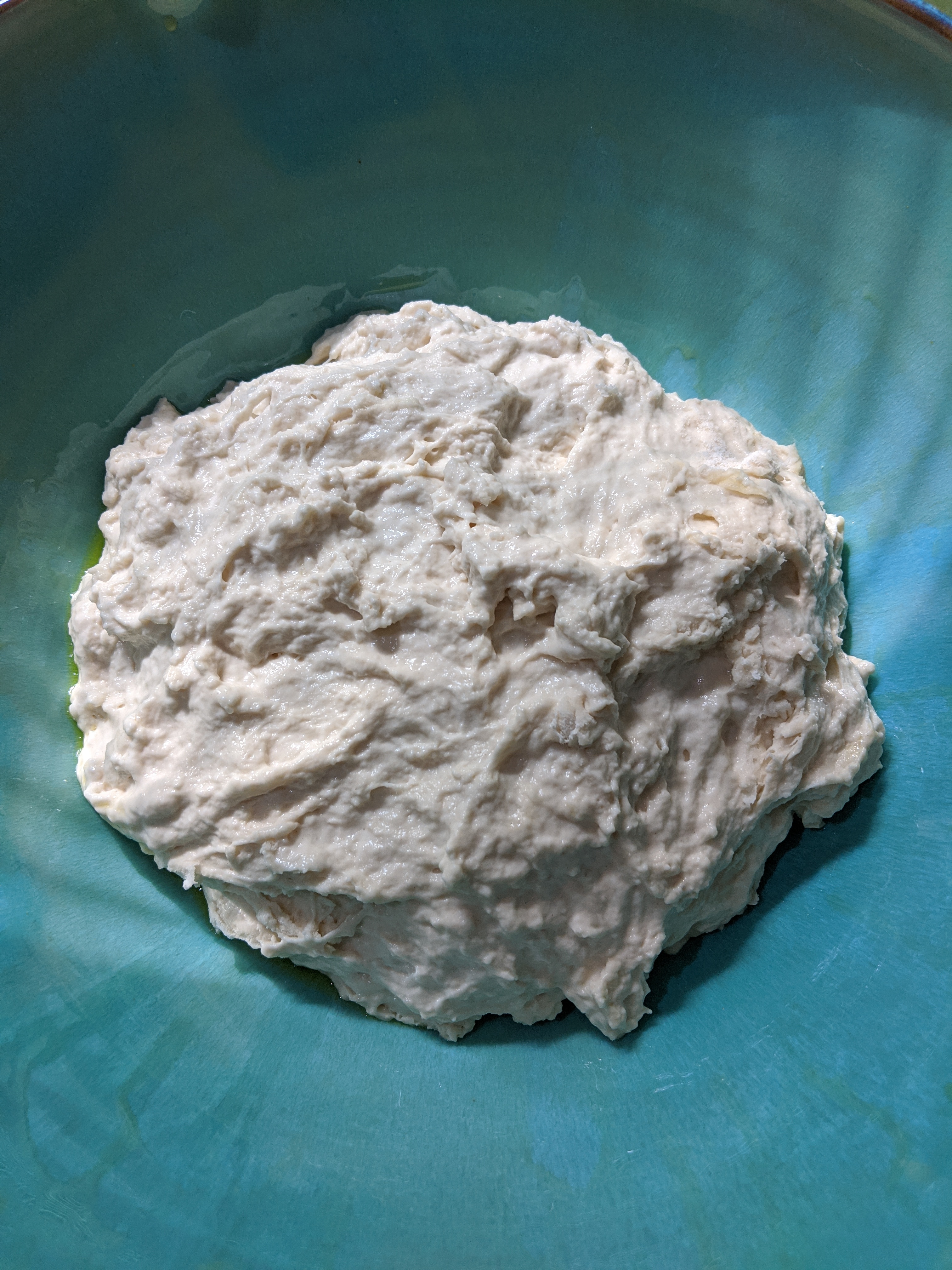 - After it is finished the first rise, grease a baking pan with a generous amount of olive oil and lay the dough on top. Cover the dough with some plastic wrap and place in the fridge overnight.