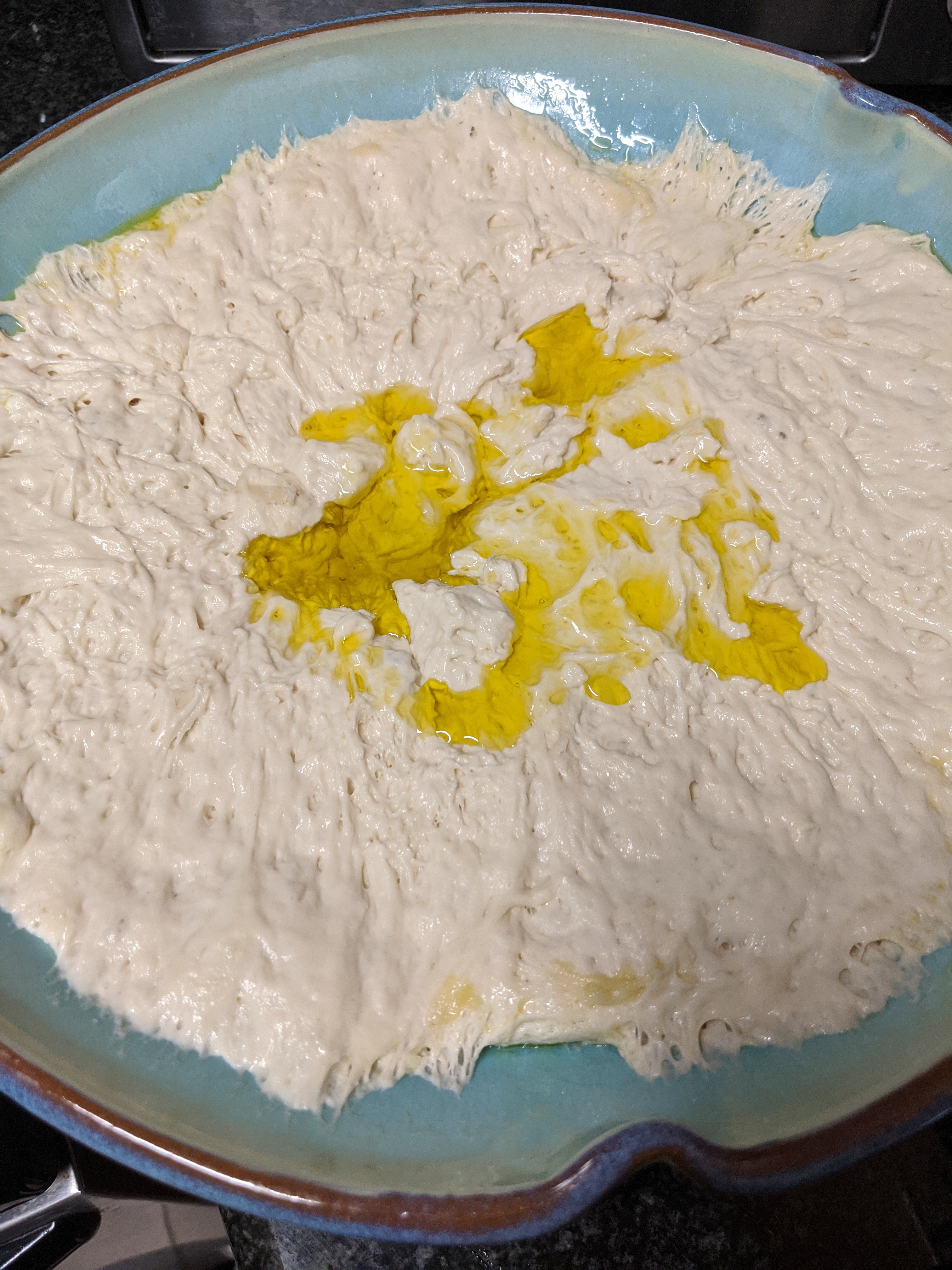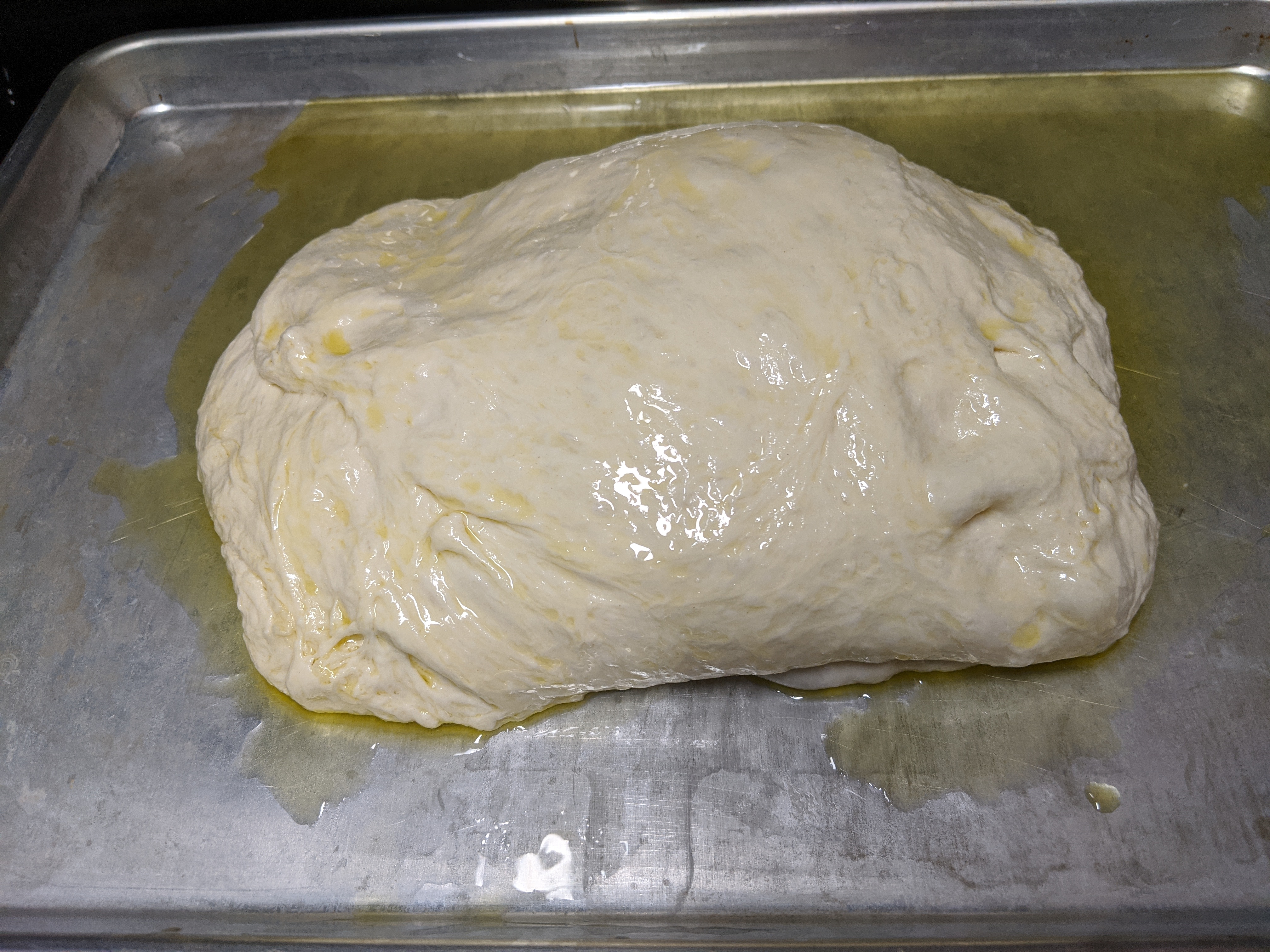 After it is finished the first rise, grease a baking pan with a generous amount of olive oil and lay the dough on top. Cover the dough with some plastic wrap and place in the fridge overnight.