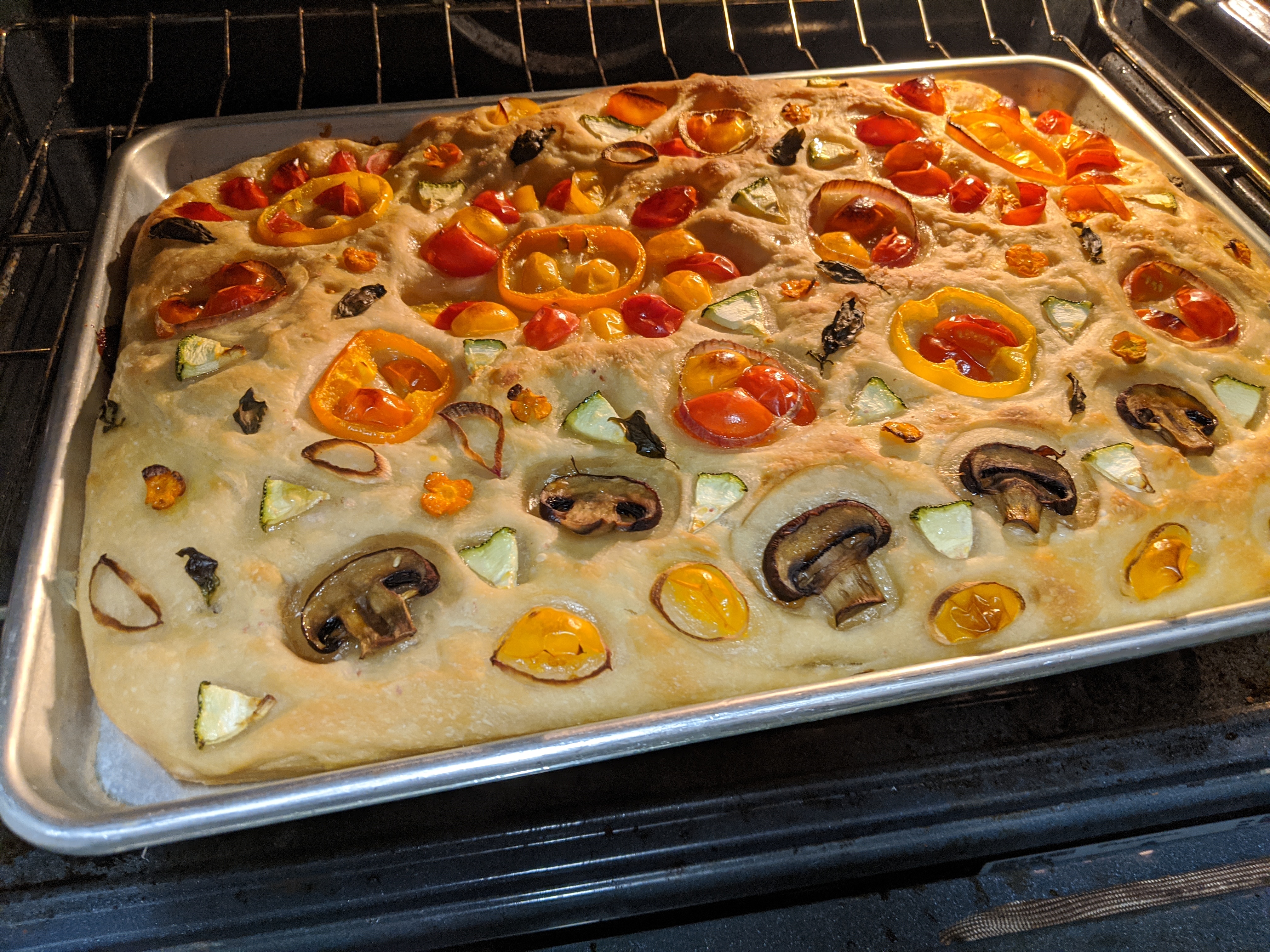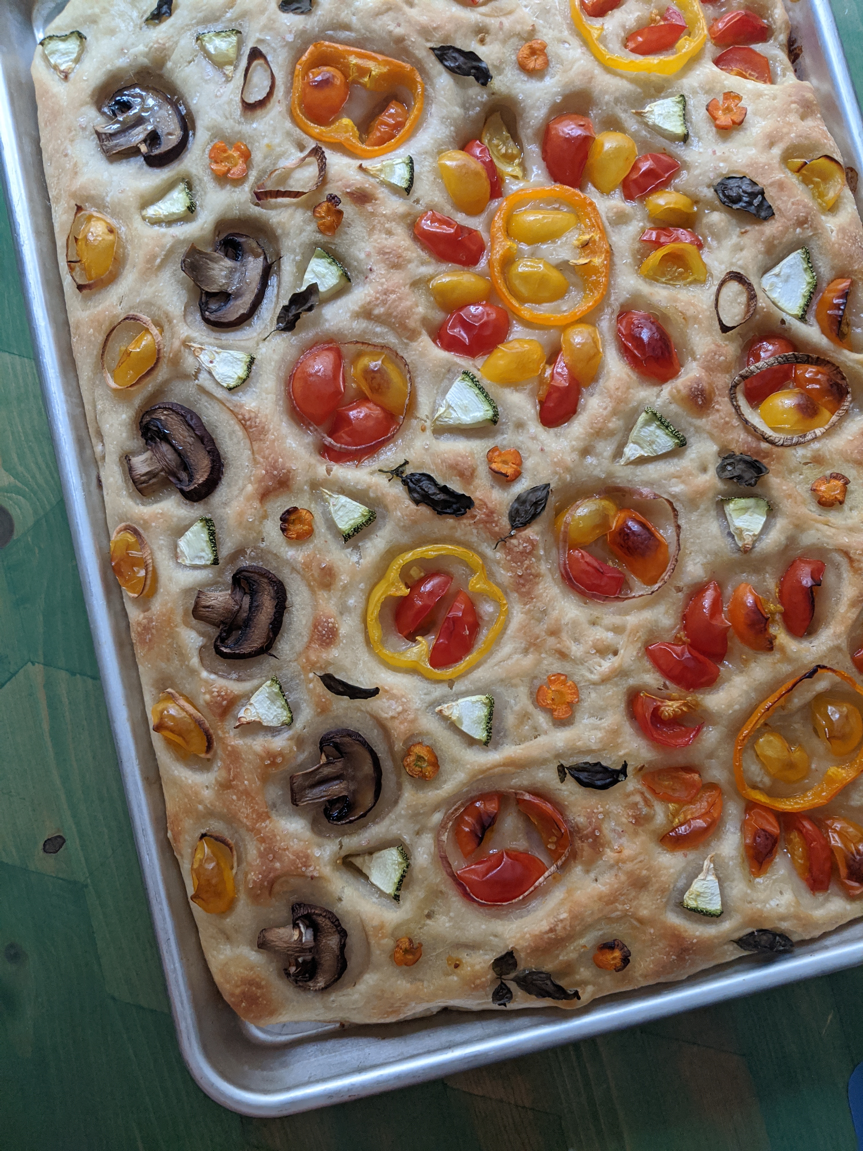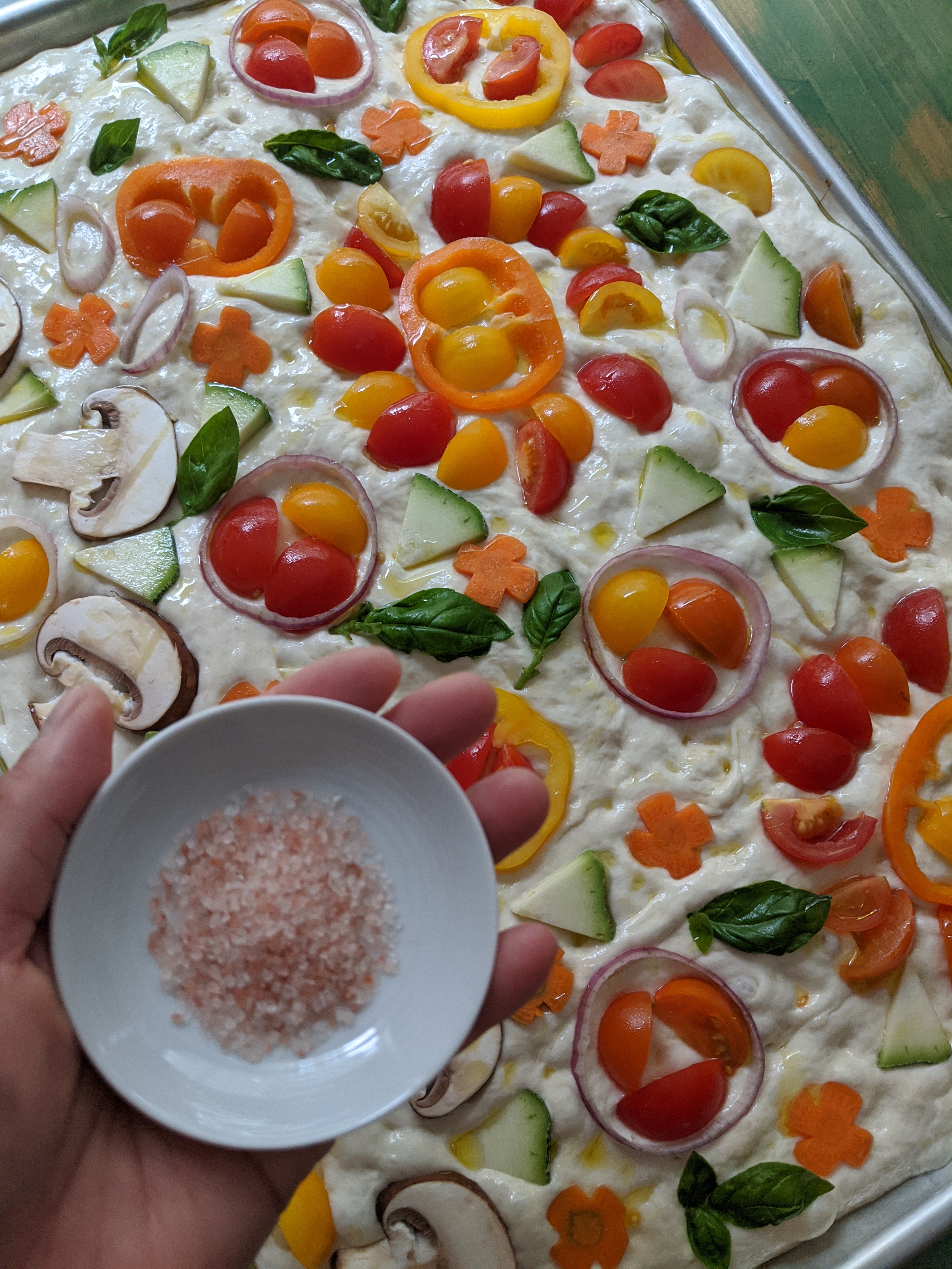 - To decorate the dough, cut up a variety of vegetables. I used peppers, mushrooms, onions, zucchini, and tomatoes. Lay the vegetables over the focaccia. Generously sprinkle with coarse salt.