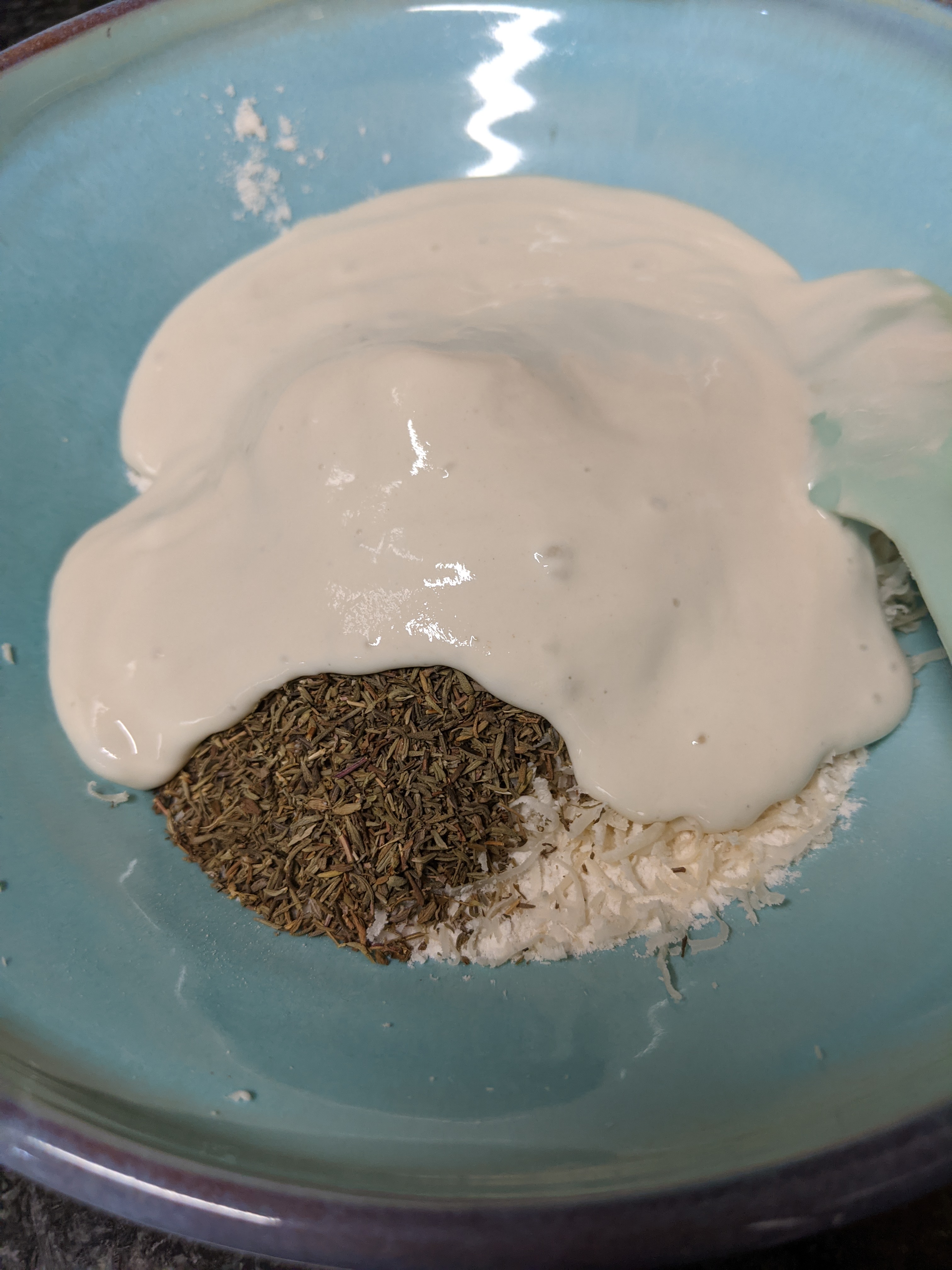 In a bowl, mix 1 cup whole wheat flour, 1 cup sourdough starter, 1/4 cup Parmesan cheese, 1/8 cup ground flax, 1/4 cup thyme or dry herbs and 1/4 cup olive oil. Mix everything together.