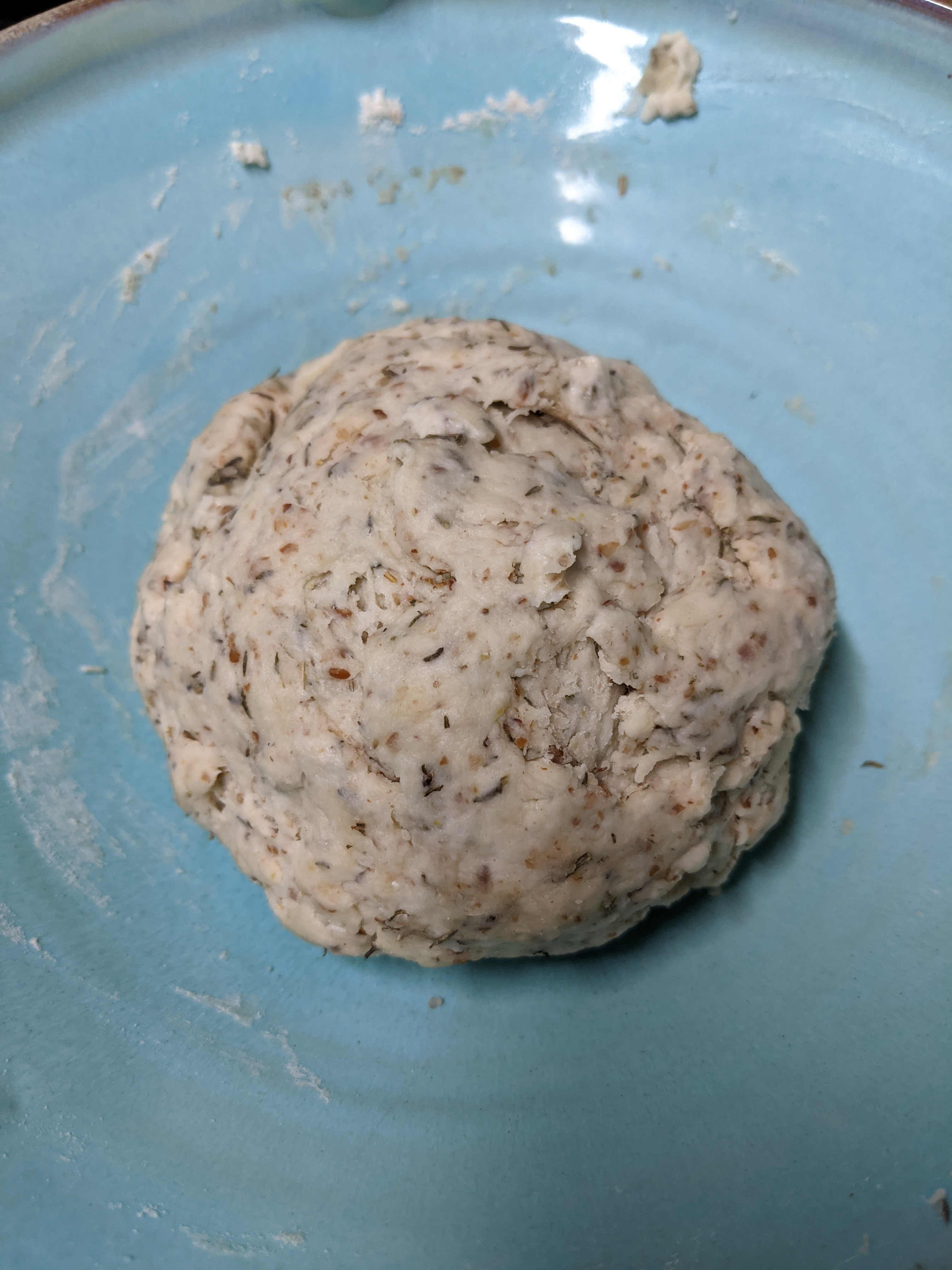 - In a bowl, mix the flour, sourdough starter, Parmesan cheese, flax, herbs, salt and oil.