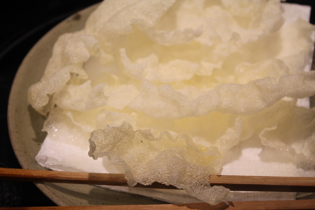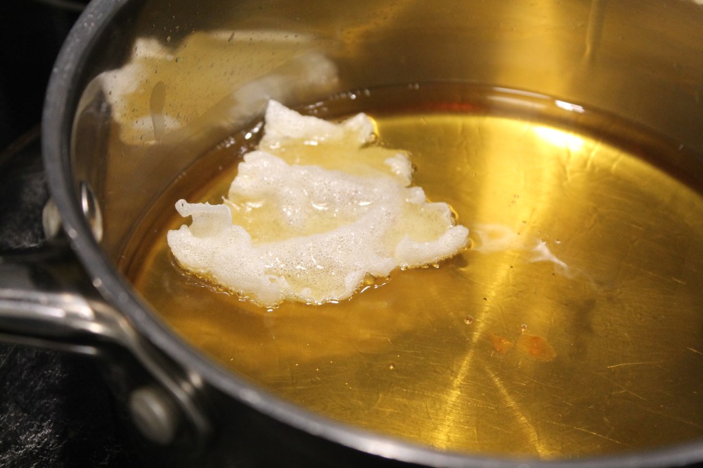 My favorite part is watching the rice sheet puff up. I remember as a kid, my mom would buy dried shrimp chips and fry them like this. You can find these disks in Asian markets. They are usually paired with Peking Duck.