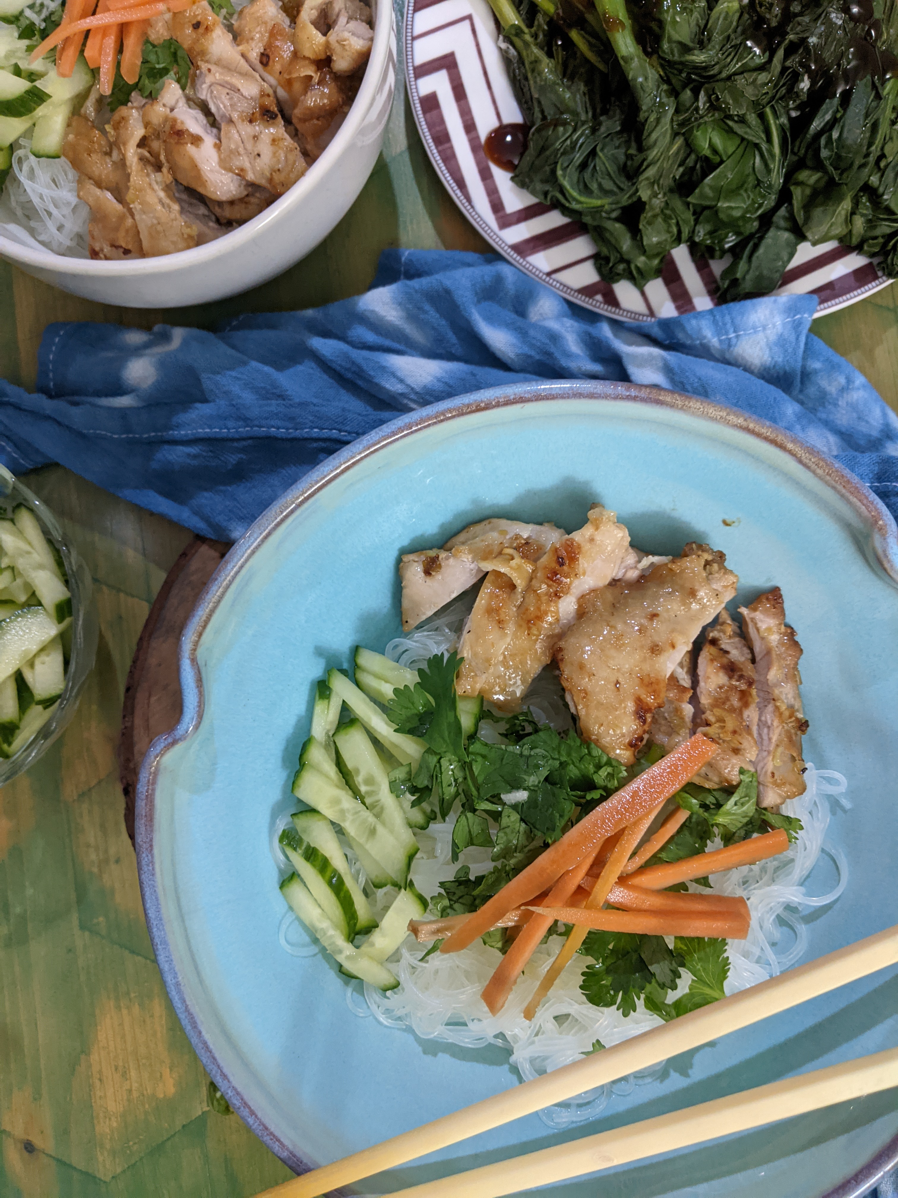 Cut the chicken into strips and serve over rice or vermicelli noodles. Enjoy!!