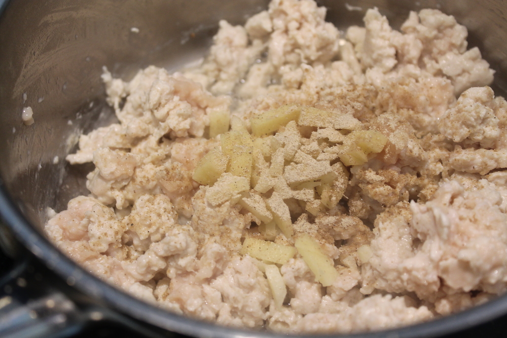 Begin by pan frying your ground chicken. When almost cooked through add your garlic and ginger.