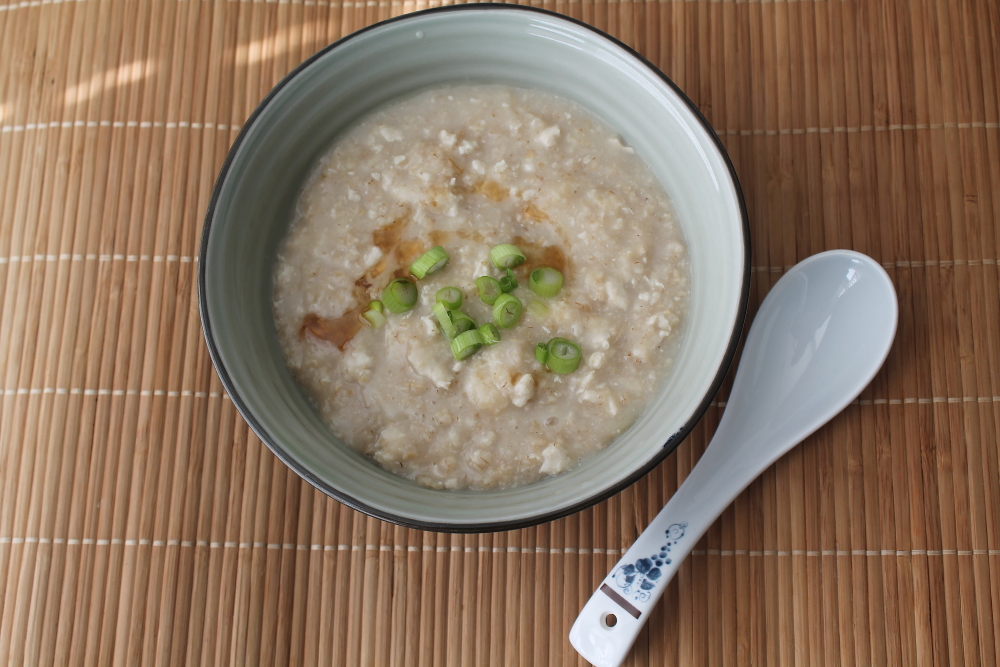 When the oatmeal is done, top with some fresh green onion, white pepper and some sesame oil. Enjoy on a nice cool morning.