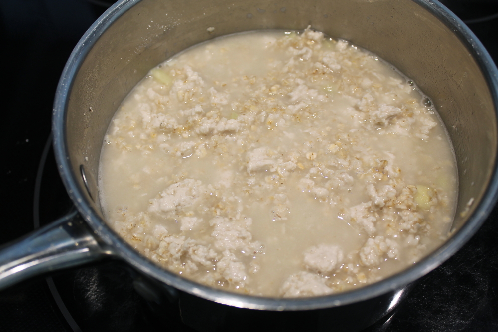 Begin by sautéing the ground chicken in some oil. When almost done, add the ginger and garlic. Mix in the oatmeal and add in the broth. Stir well and allow to simmer on medium heat. Simmer for about 10 minutes. Add additional water if the oatmeal is too thick. You want a thick soup consistency.