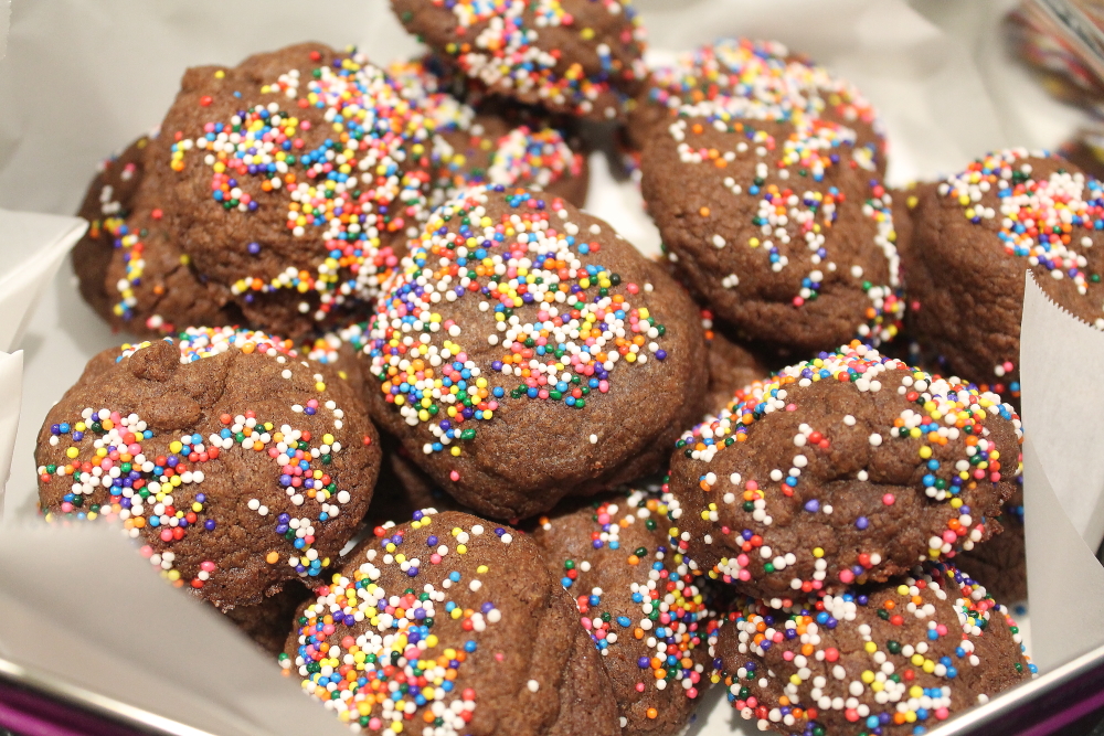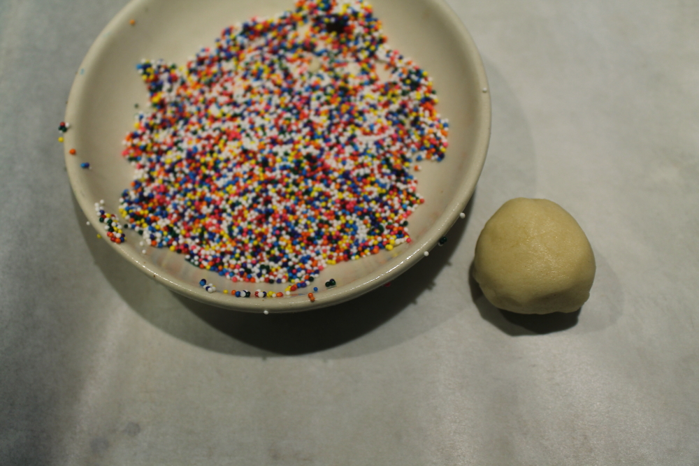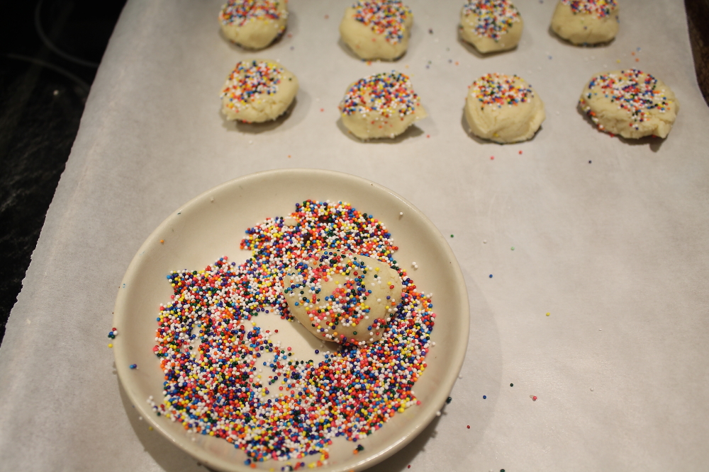 Roll each ball into some sprinkles. You don’t need to use nonpareils, other sprinkles work as well. This is similar to making snickerdoodles.