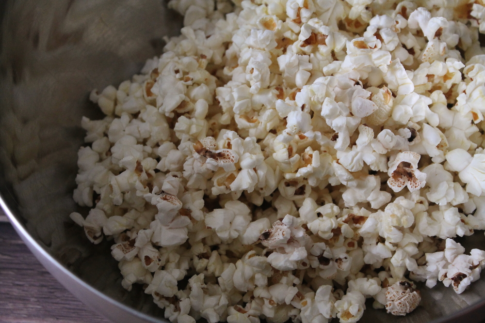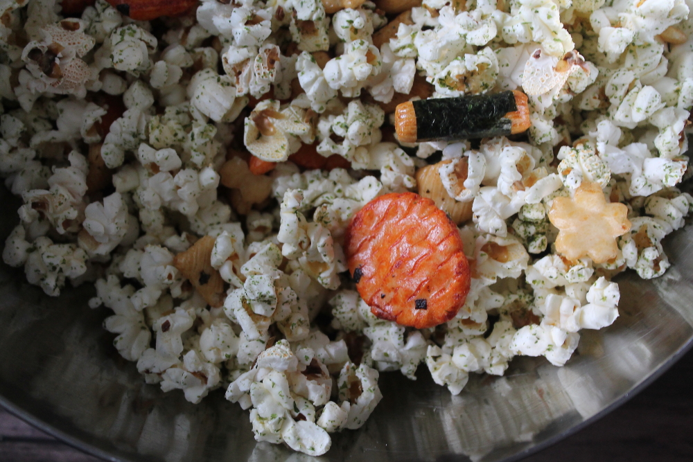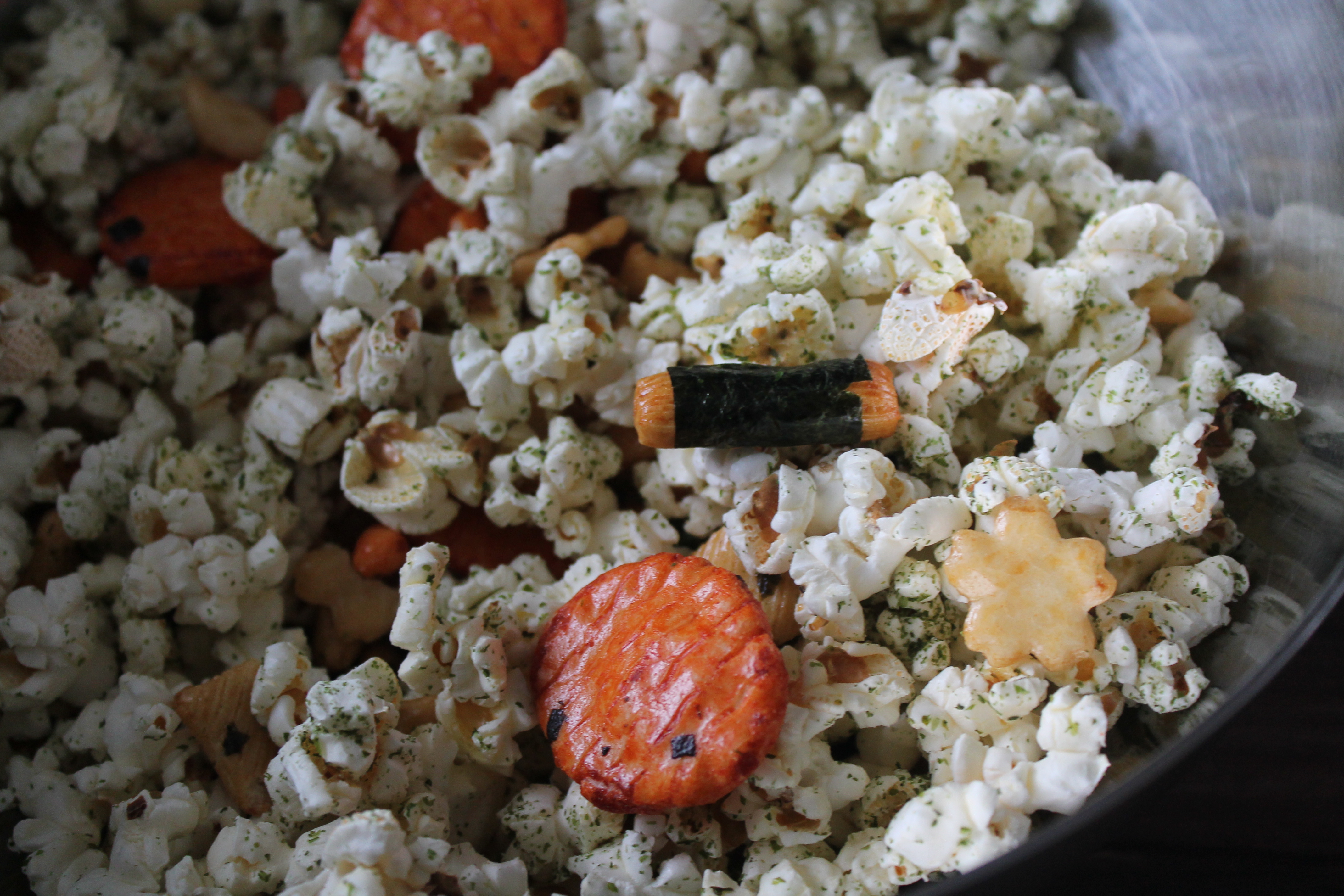 Add some rice crackers. I think I like about a 4 to 3 ratio of popcorn to rice crackers. But feel free to add as much or little as you like.