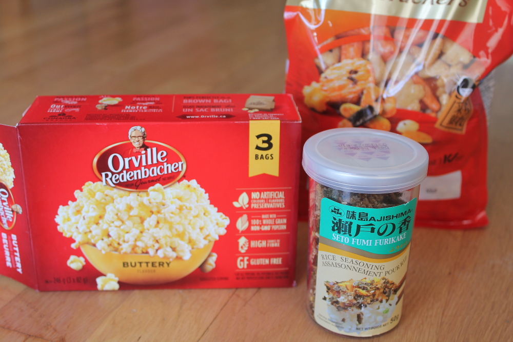 To make hurricane popcorn. You will need some popcorn, Furikake seasoning and some rice crackers.
