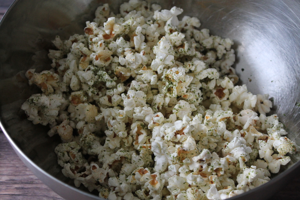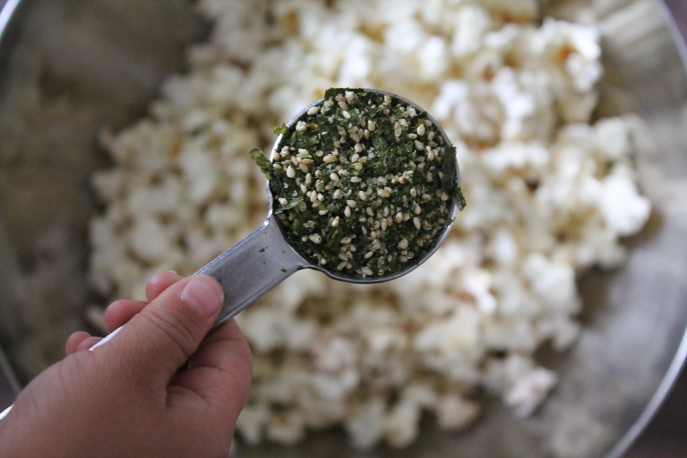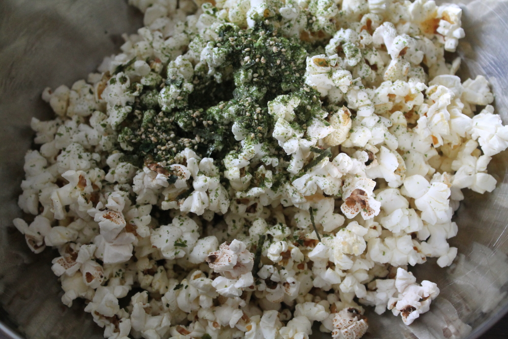 To the hot popcorn, add 3 tablespoons of Furikake seasoning and mix well.