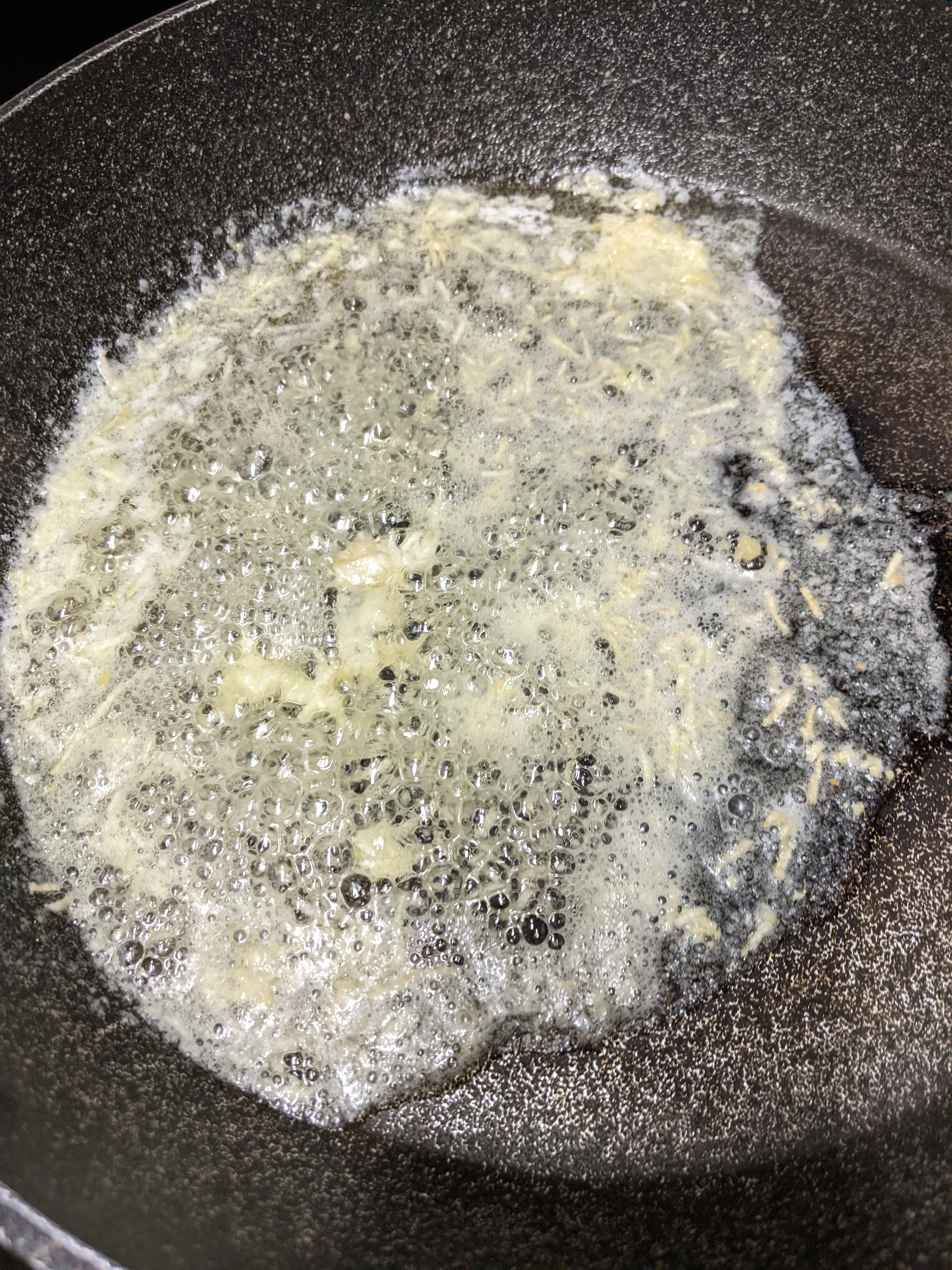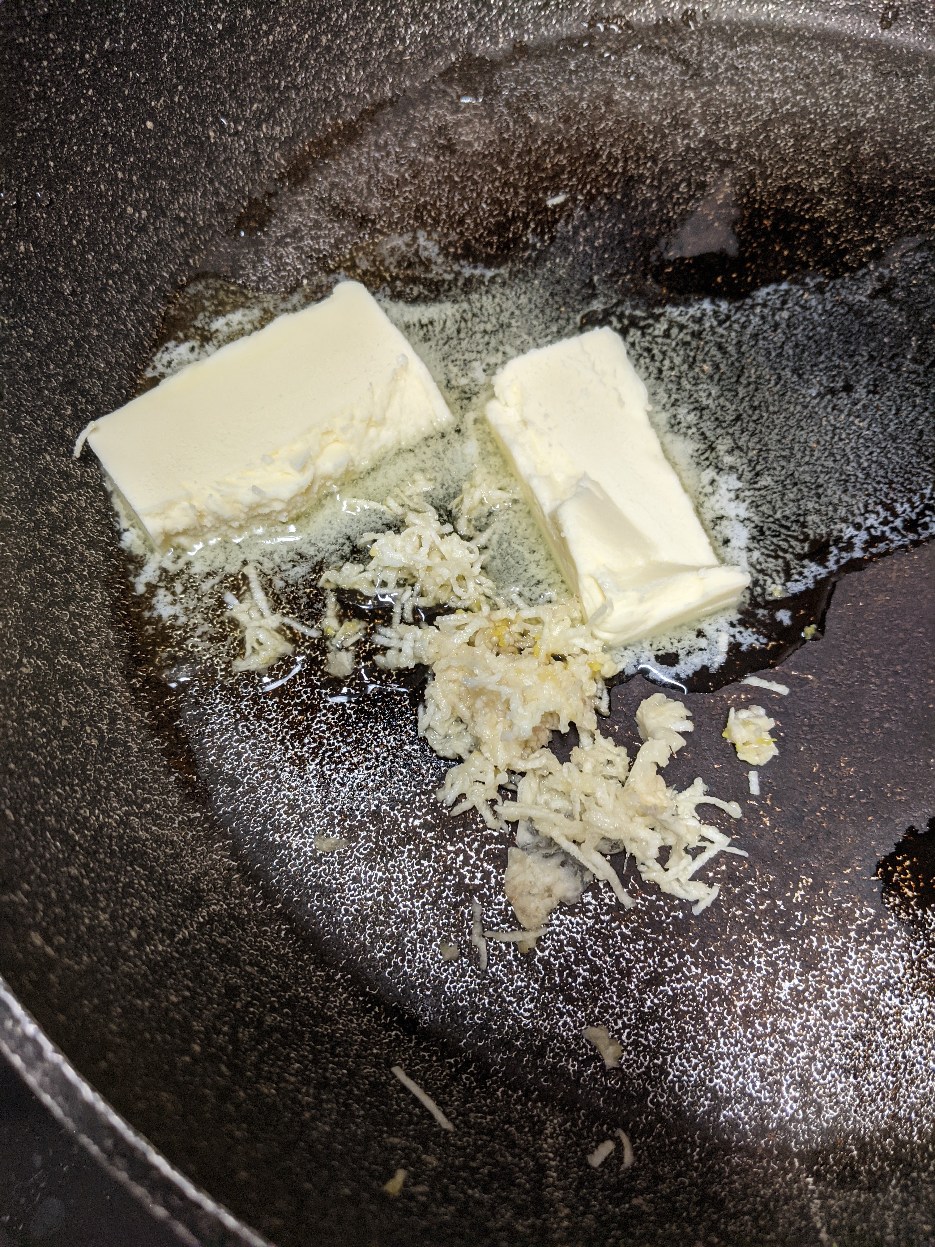 - In a frying pan, melt butter. Grate one clove of garlic into the frying pan. Cook the garlic for a couple minutes.
