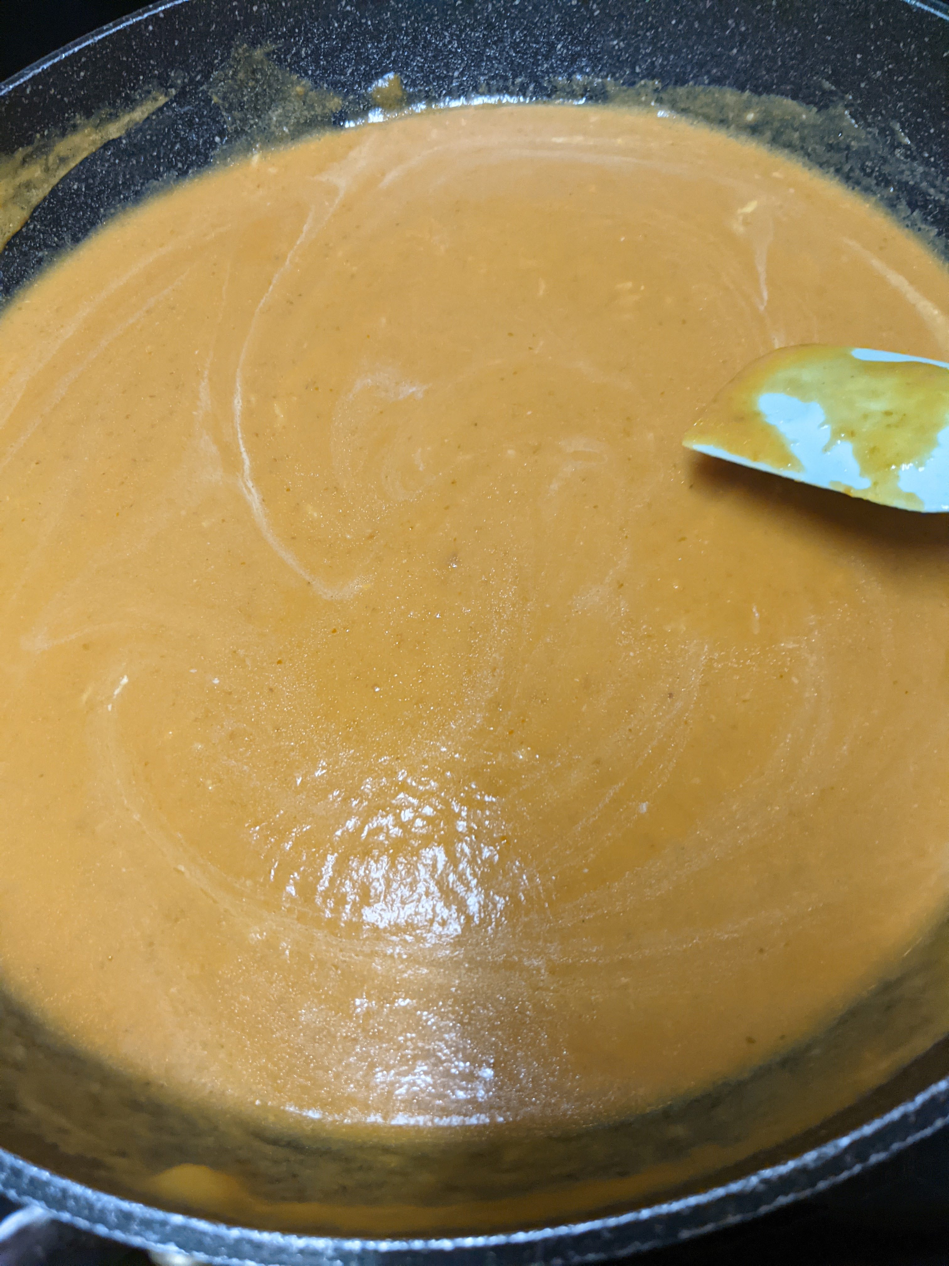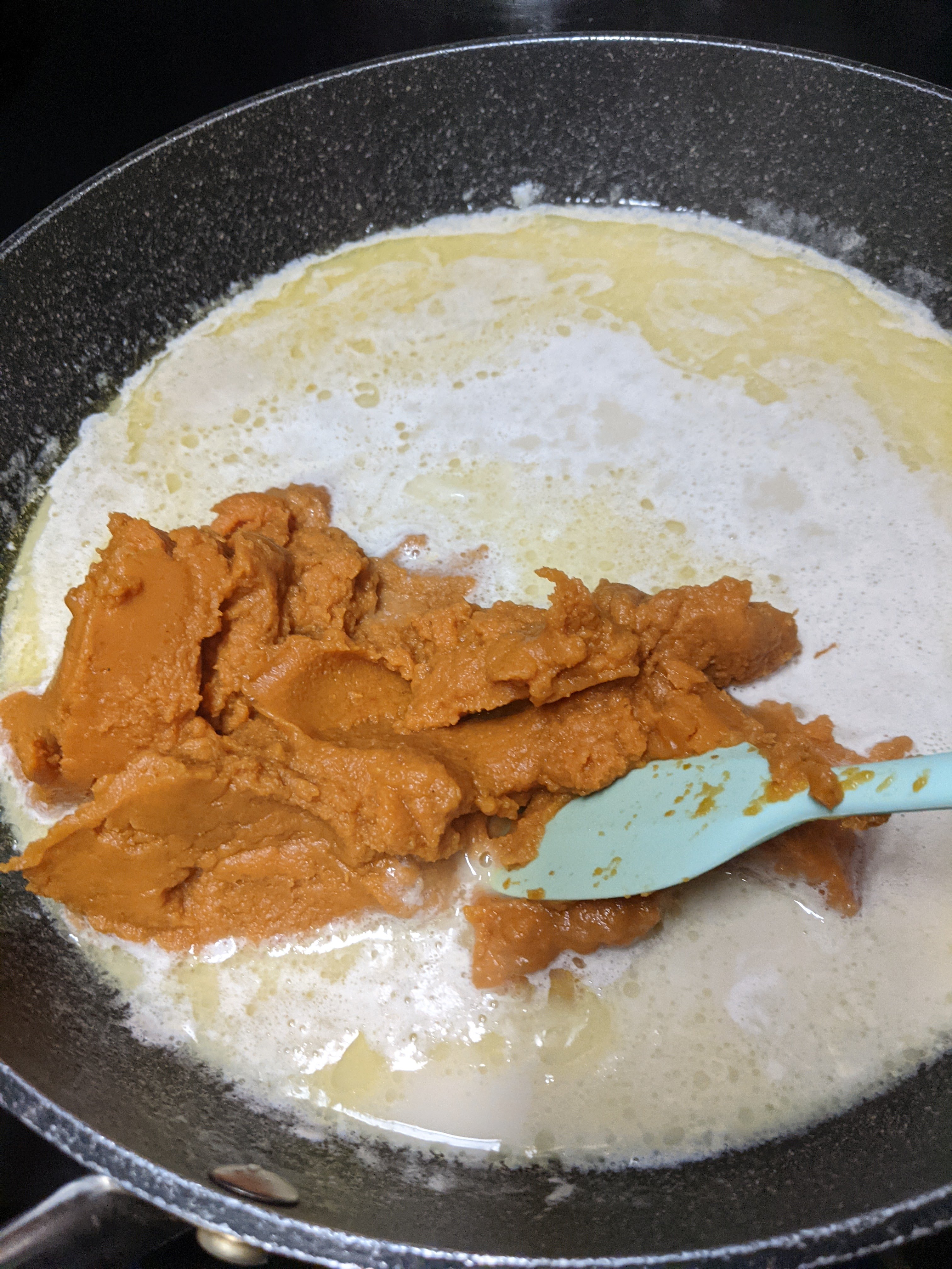 - Add the 2 cups of milk to the frying pan. Give it a stir and then add the 1 1/2 cup of pumpkin puree.
