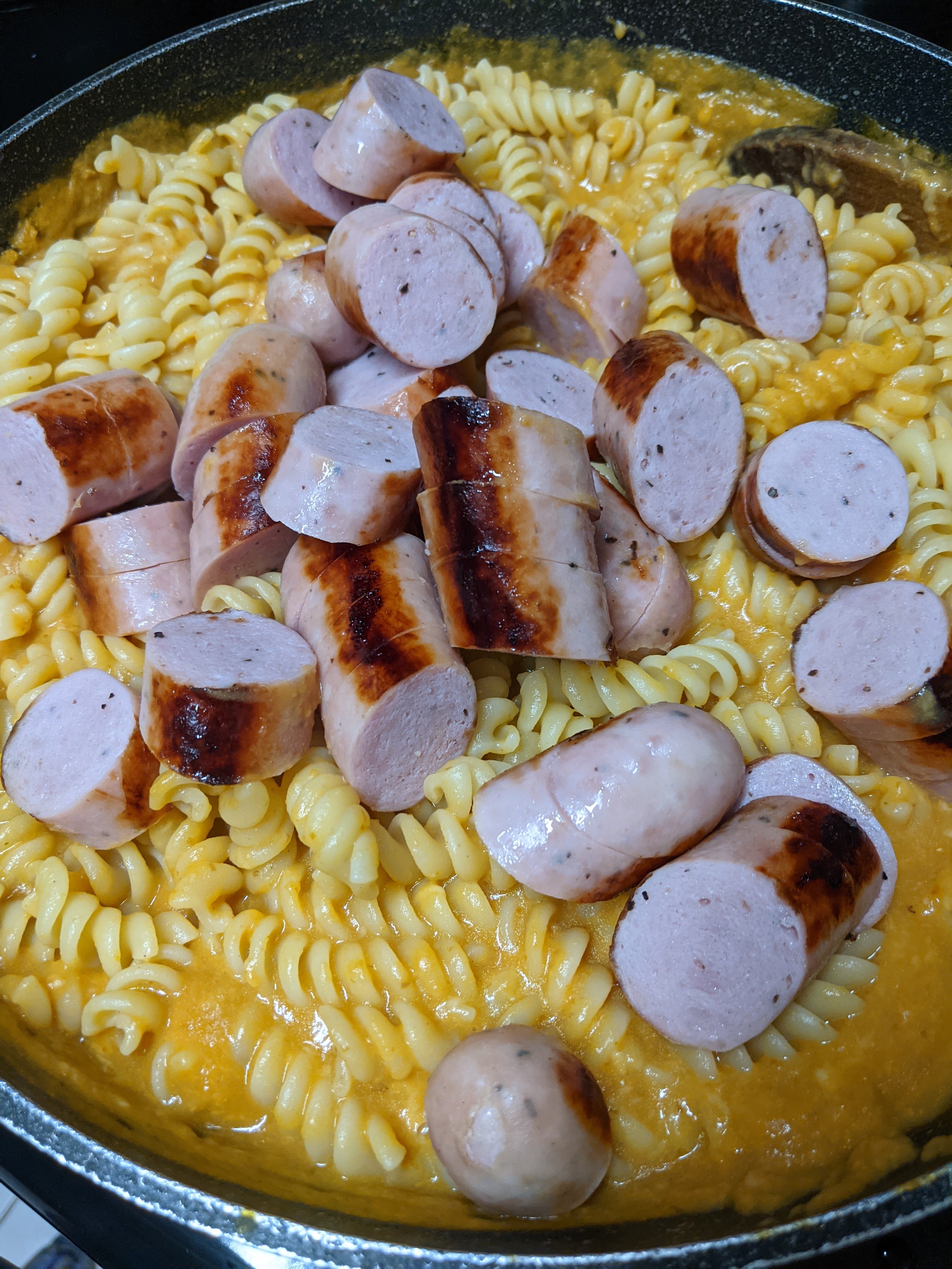 - Mix in your pasta and other pasta ingredients. We used some cooked sausages.