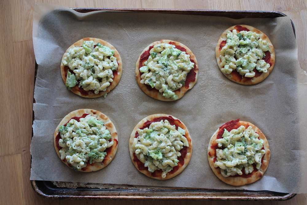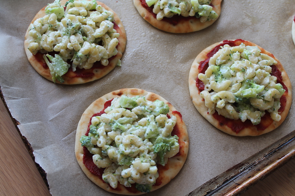 Top each pizza with a generous amount of pasta.