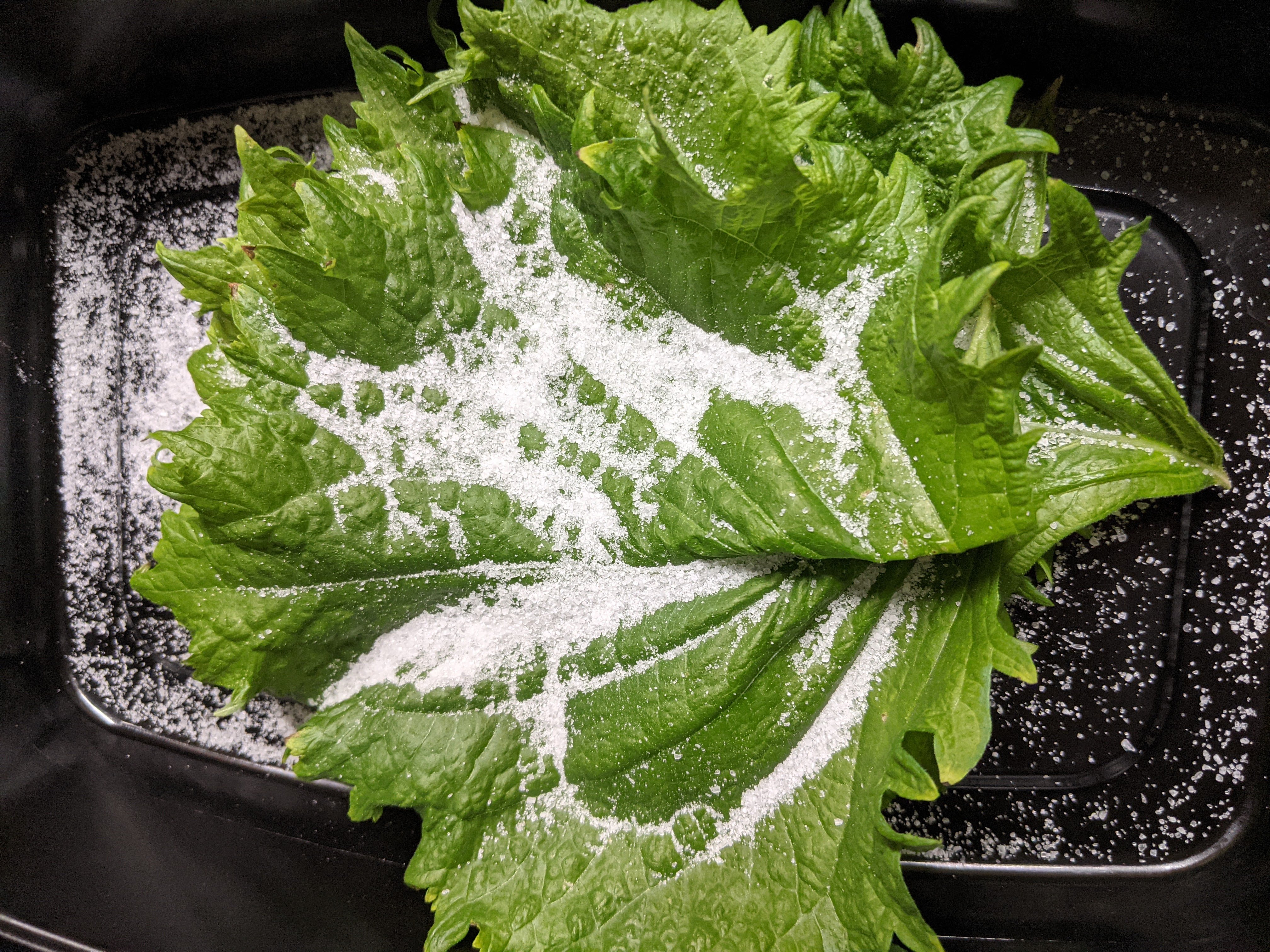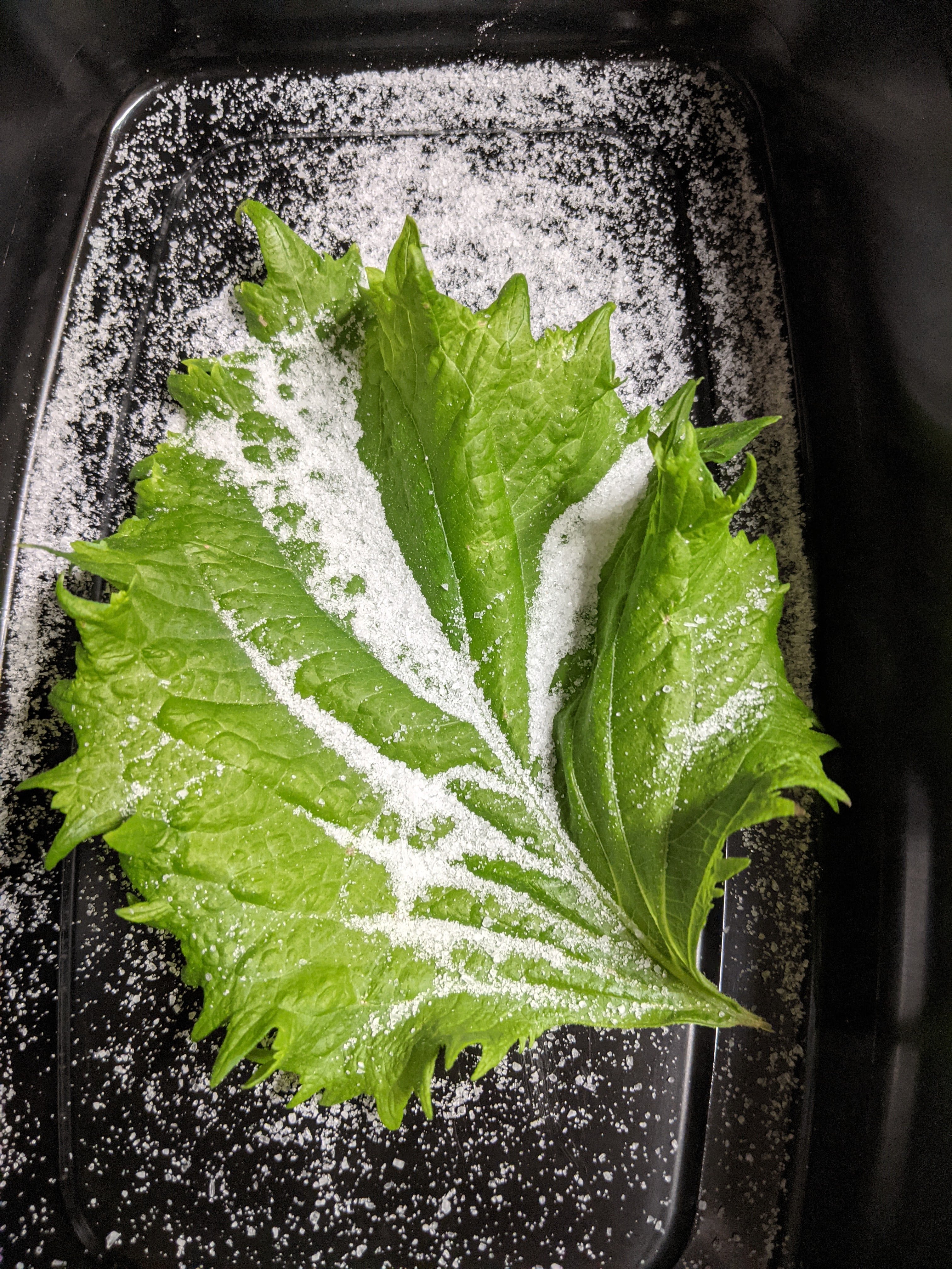 To preserve you shiso leaves, clean and dry your leaves. In a container, sprinkle a layer of sea salt on the bottom. Add a shiso leaf and sprinkle more salt on top. Continue with the other leaves. Leave the leaves to dry. Make sure not to cover the container to allow the water to evaporate.