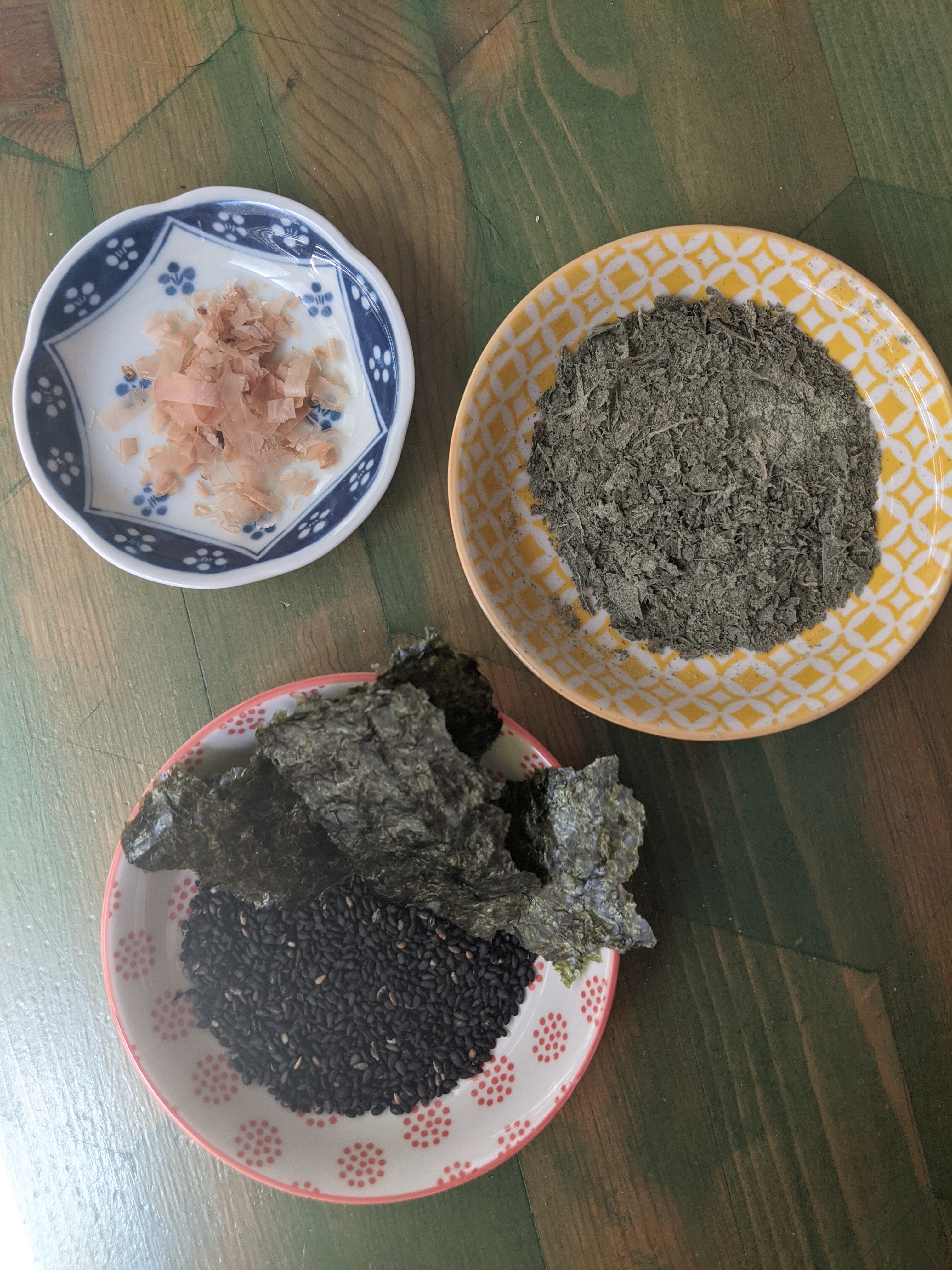 - To the shiso and seaweed, add the sesame seeds and bonito flakes.