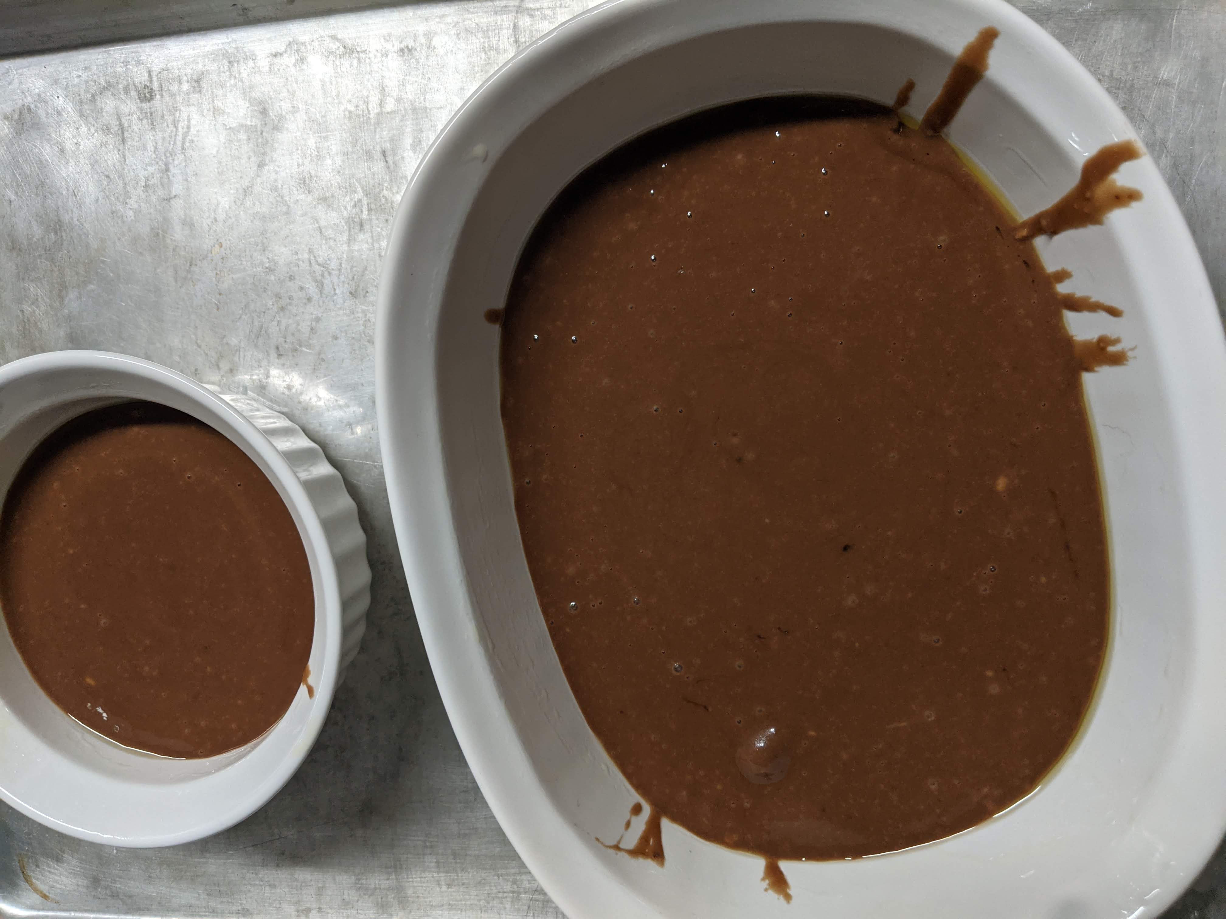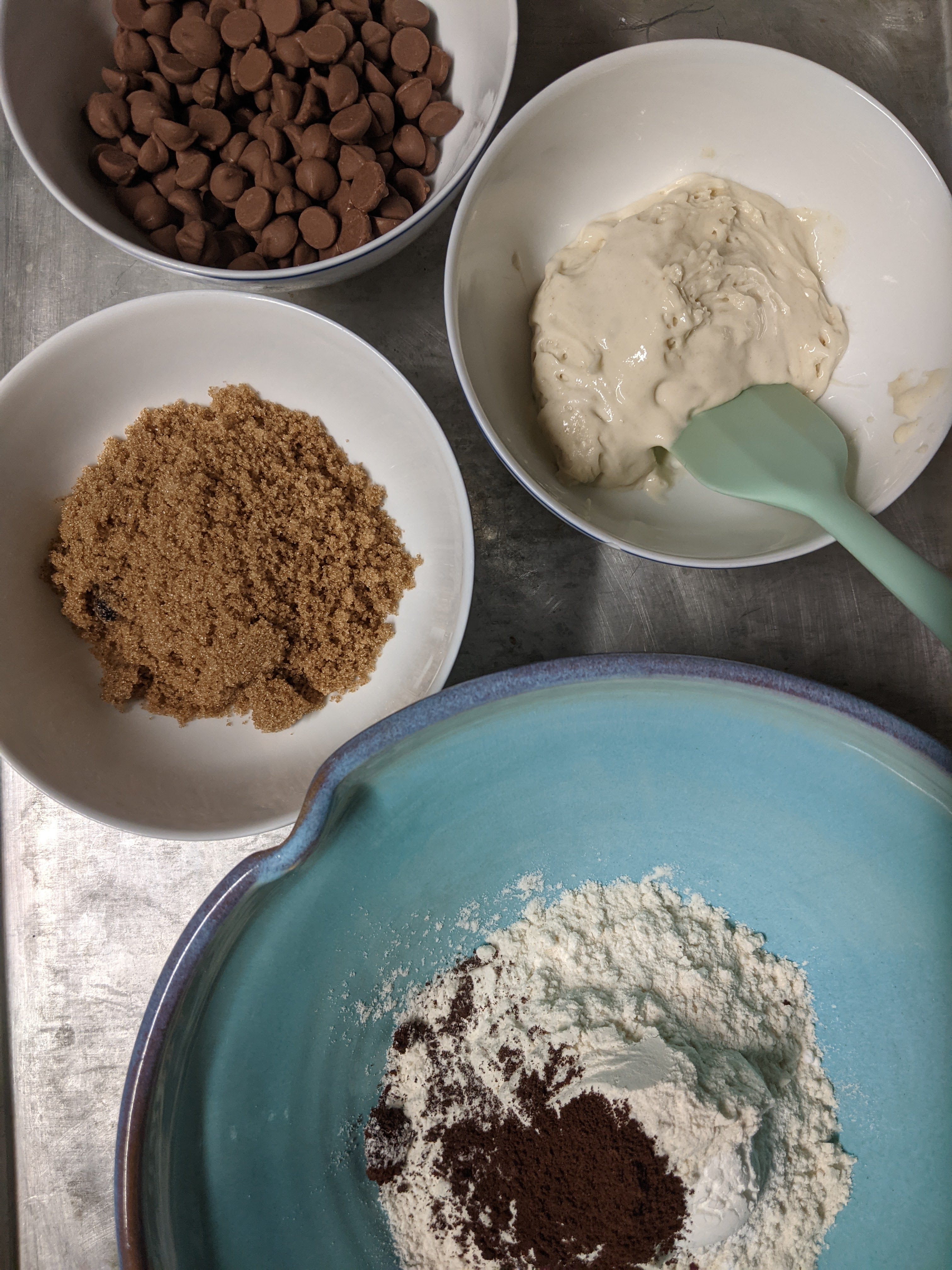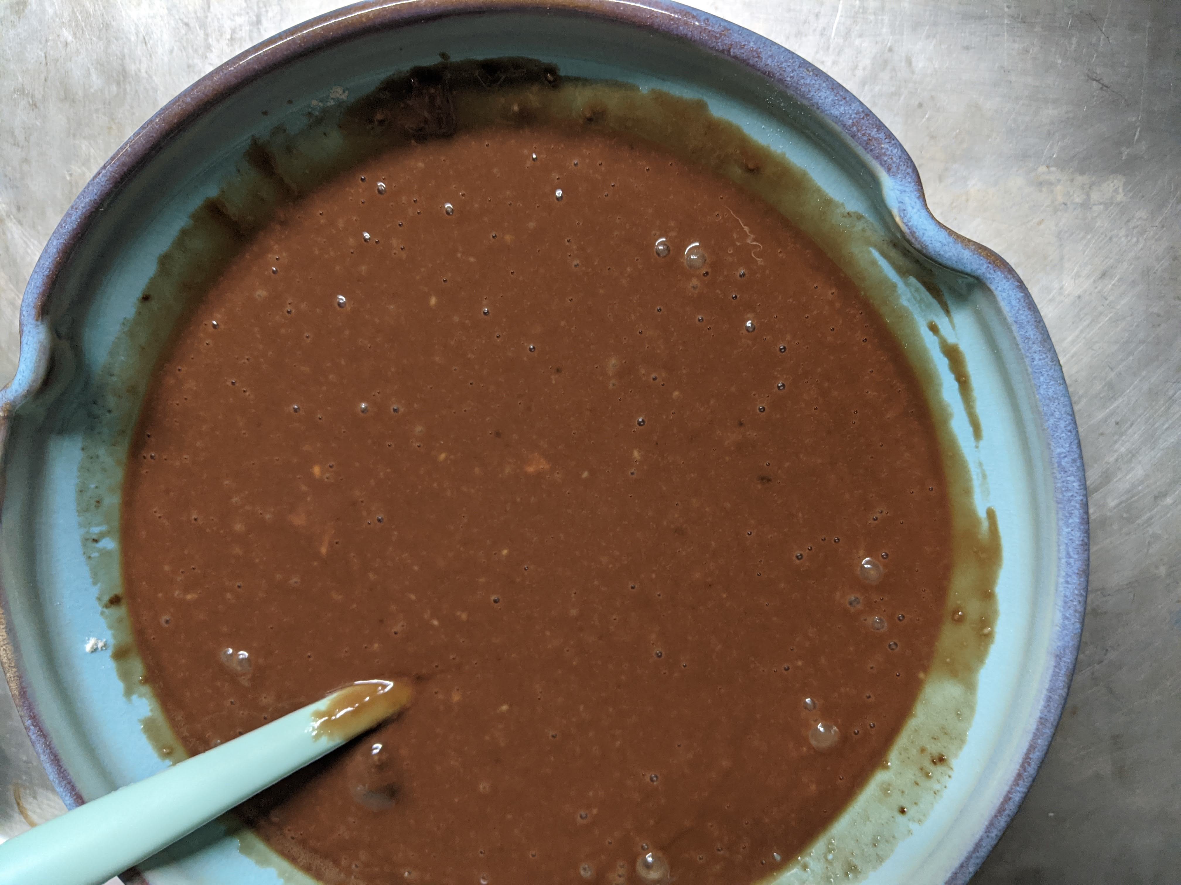 In a mixing bowl, combine 3/4 cup flour, 3/4 tsp baking powder, a pinch of salt, and 1 tsp instant coffee. Slowly add the oat milk mixture to the dry ingredients. When mostly combined, add 3/4 sourdough discard and mix well. Preheat the oven to 350 degrees F.