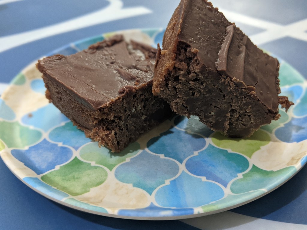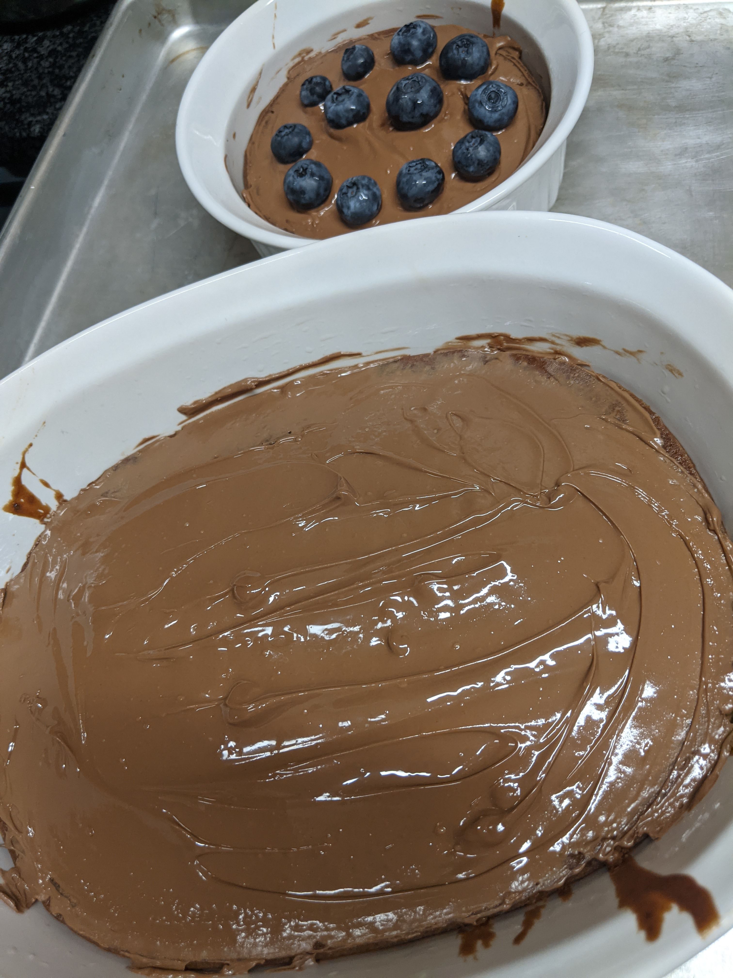 Take the brownie out of the oven to cool completely before cutting. To add a bit more decadence, sprinkle the hot brownie with chocolate chips. This will allow the chocolate chips to melt and become easier to spread. Spread the chocolate once it has melt and allow it to cool. You can get extra fancy and decorate the brown with some fresh blueberries or any other fruit. Enjoy!!