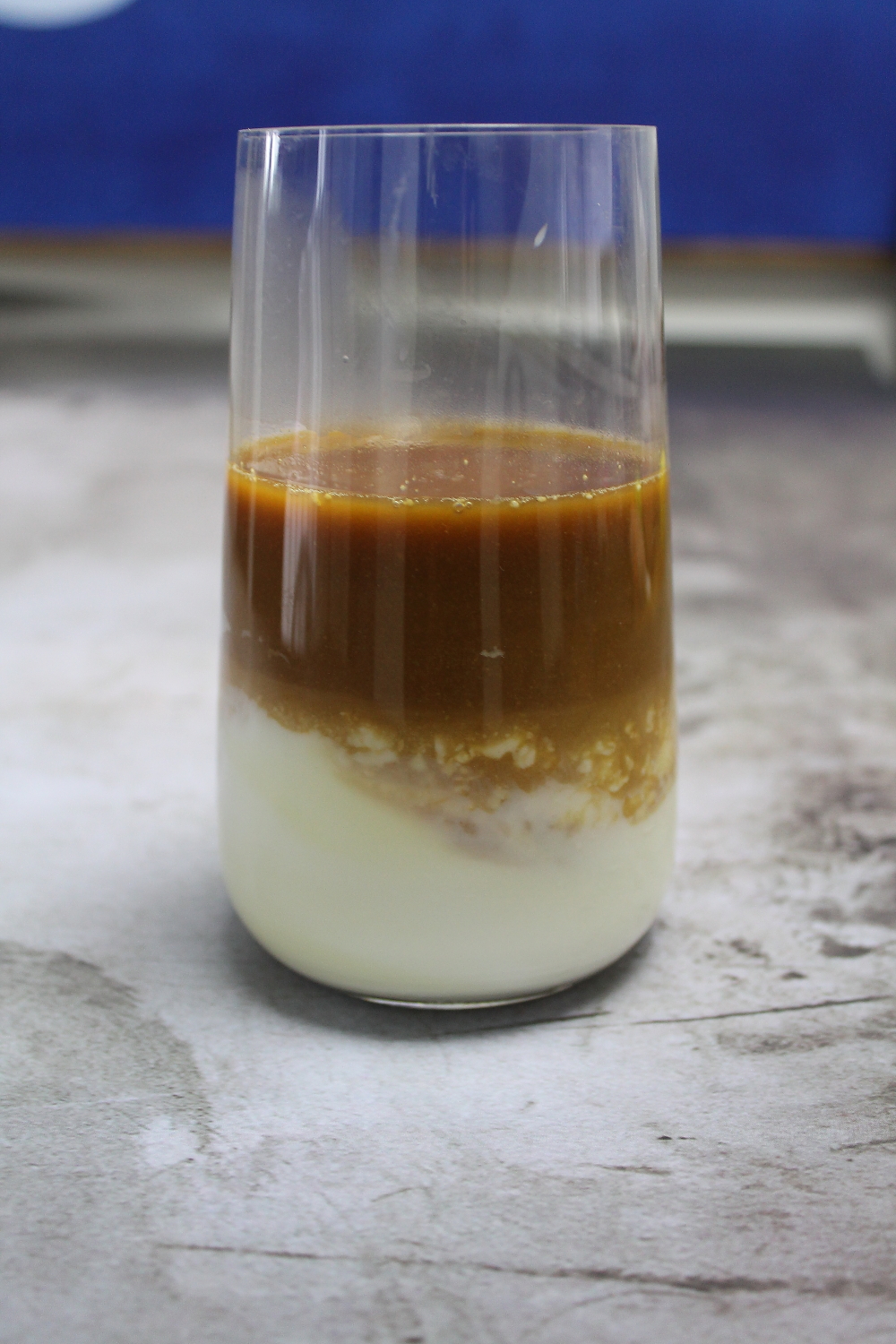 Mix together the yogurt and the condensed milk. Pour in the coffee. Stir together before drinking. Enjoy.