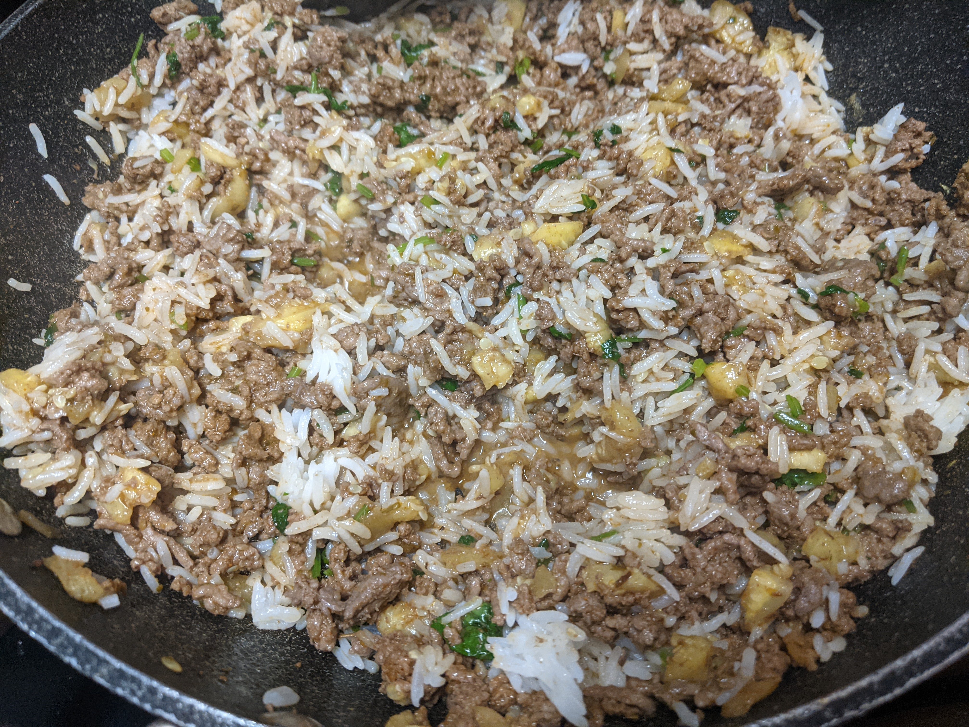 - In a frying pan, cook 1/2 lb ground beef. Add 4-5 tbsp of taco seasoning. Cook till ground beef is done. Season with salt and pepper.
