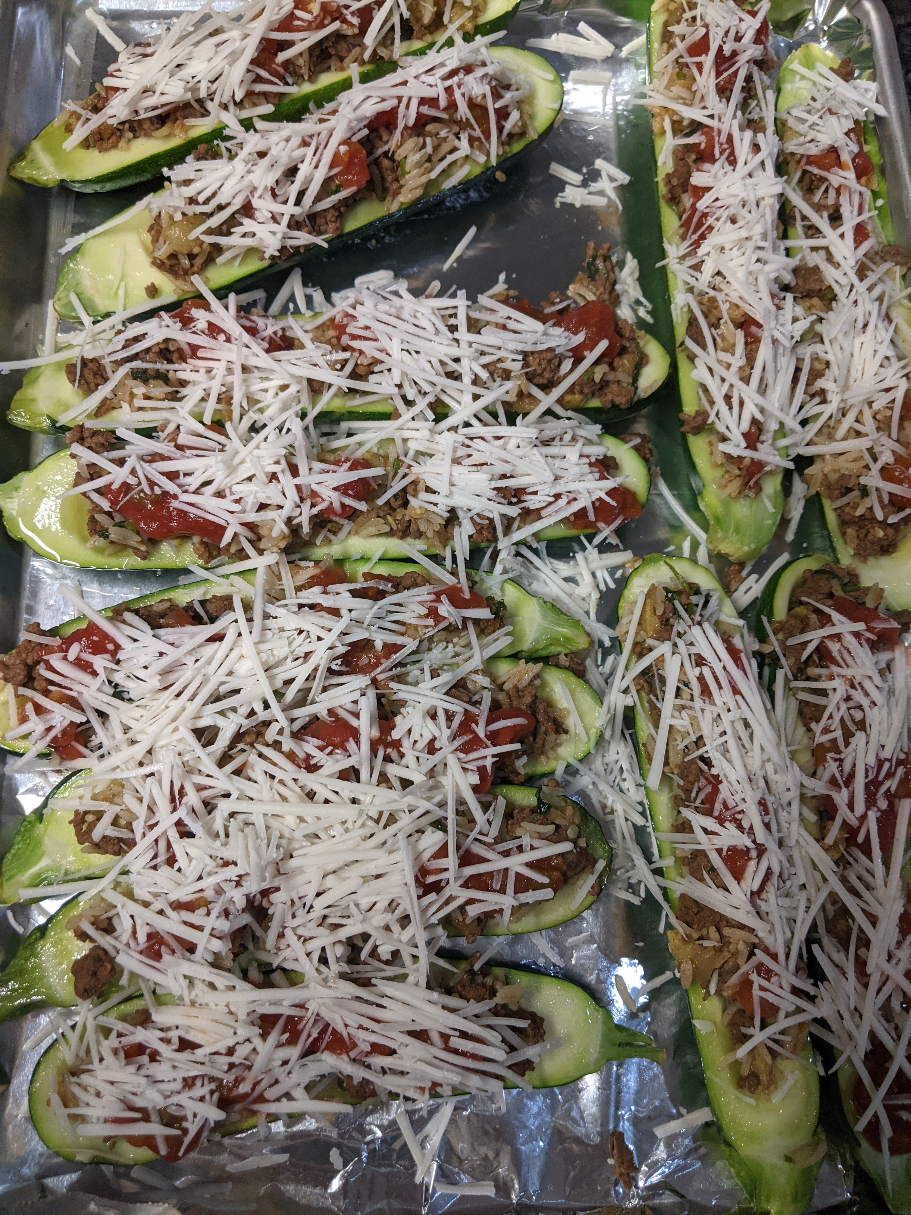 - To assemble the zucchini boats, portion out the ground beef into the zucchini. Top each with salsa and grated cheese. Return the stuffed zucchini back into the oven for another 10-15 minutes or until the cheese has melted.