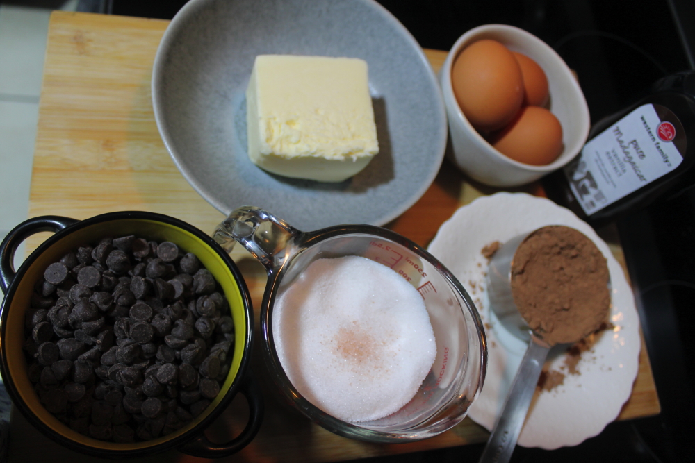 To make these you need butter, eggs, vanilla, sugar, cocoa powder and chocolate chips… oh and don’t forget the salt!