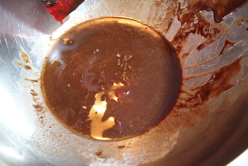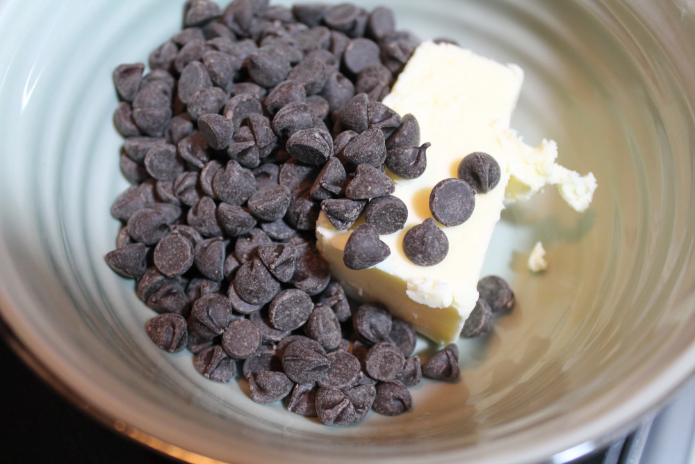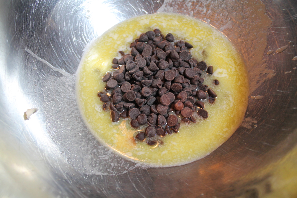 Batter: In a microwave bowl, melt the butter and chocolate chips.