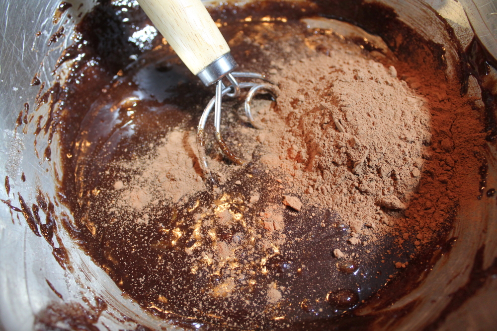 In a large mixing bowl, mix together the melted chocolate, sugar, salt, vanilla, eggs and cocoa powder. And yes add the salt, it will enhance all the flavors. Portion the batter into 11 cupcake tins. Bake for about 25 min. Check with a toothpick to see if the batter is cooked. Cool cupcakes on a cooling rack.