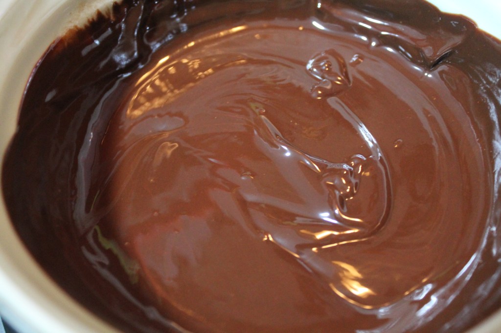 Icing: While the cupcakes are baking, time to make your icing. Melt together the butter and chocolate chips. Allow this to cool at room temperature until the cupcakes are ready to frost.