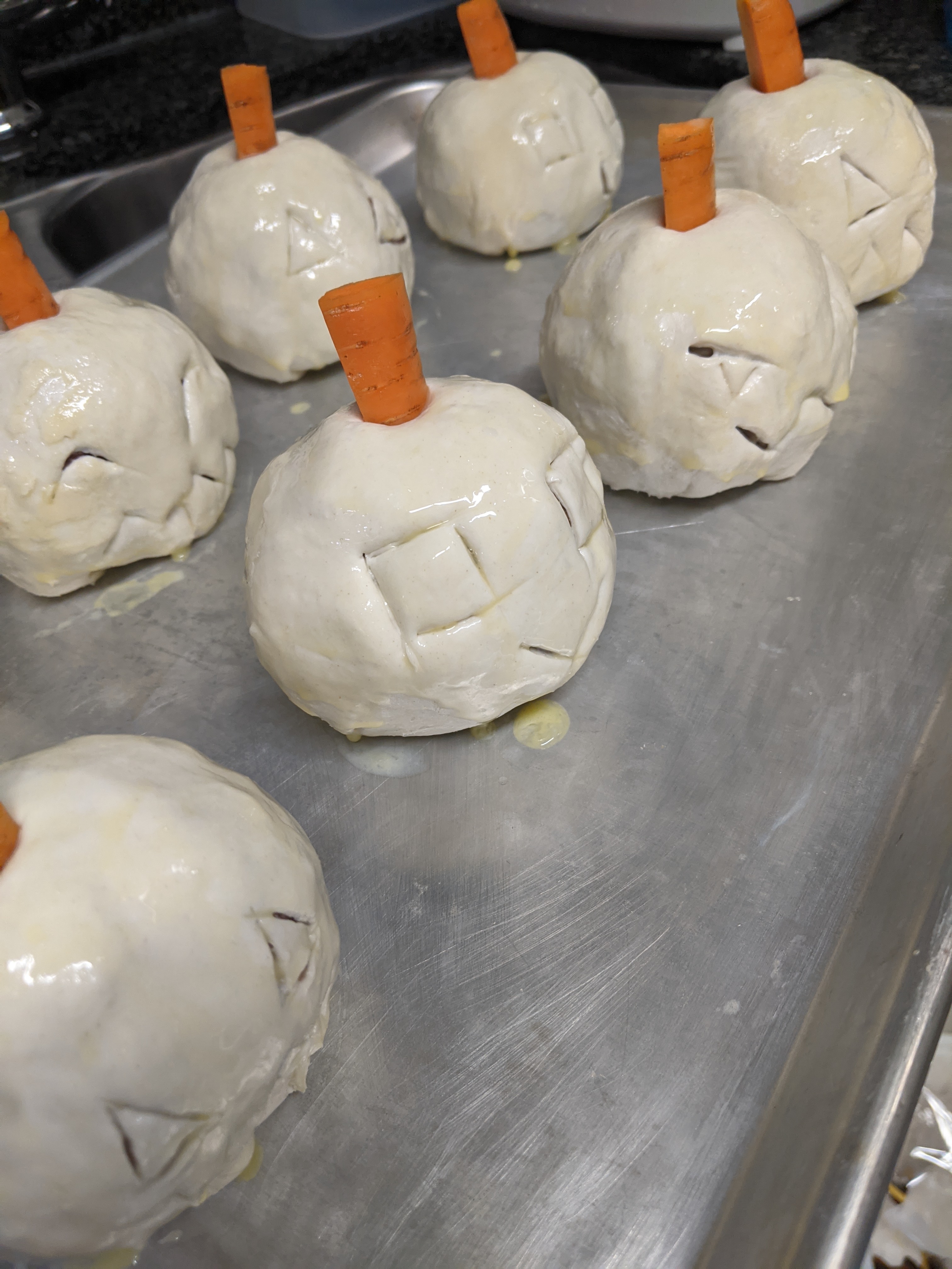 - Take the puff pastry sheet and wrap each meatball. You can leave your meatloaf wellington like this or make them look like pumpkins by cutting a face and adding a slice of carrot for the stem.