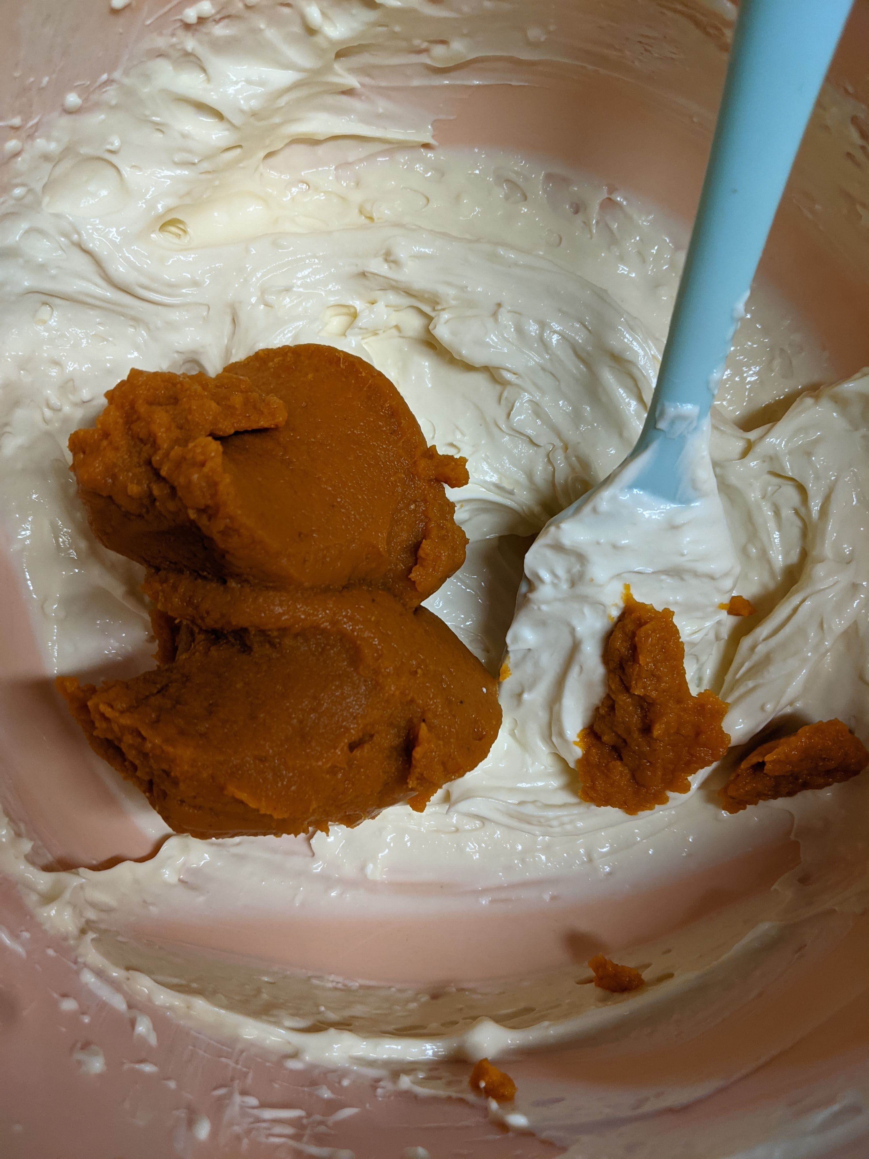 Split the mixture into two. Taking 1/2 of the mixture, mix in 1/2 cup pumpkin puree and 2 teaspoons of cinnamon. If you would like, you can use pumpkin spice instead. I’m not a huge fan of cloves so I use only cinnamon.