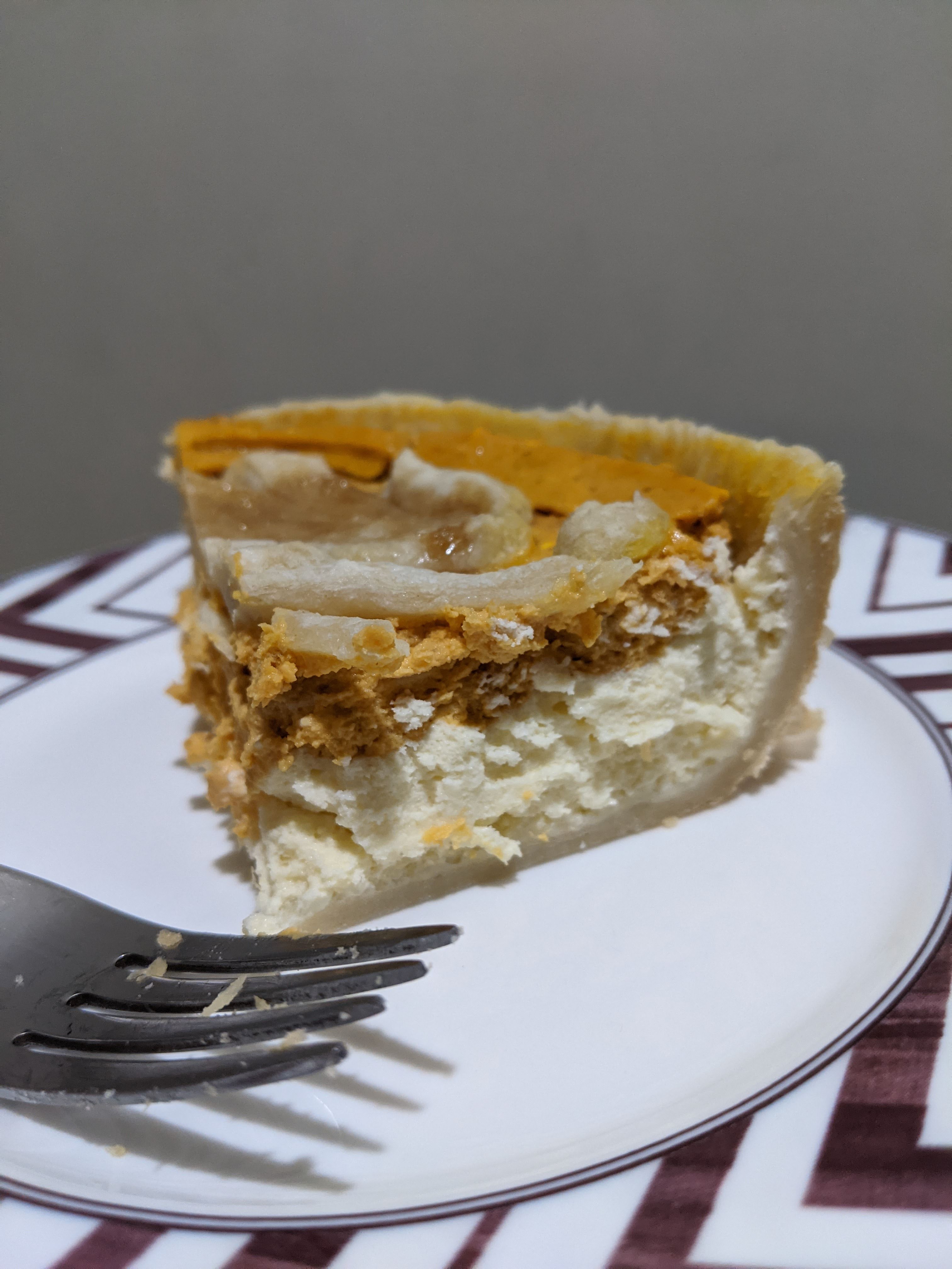 Roll out the puff pastry and line a pie tin or baking pan with the puff pastry. Pre-bake the pie crust in a 450C oven for about 10-15 minutes. This will help the dough stay crispy while cooking the filling. When the crust is baked, pour in the different layers of the filling. Start with the plain cream cheese filling and then slowly add the pumpkin filling on top. Smooth the pumpkin layer and place into a 325C oven for about 30-40 minutes or until a knife comes out clean. Let it cool for about 1 hour before putting it into the refrigerator. It is best when you chill it for at least 3 hours before cutting into it. Top with ice cream or whipped cream before serving. Enjoy!