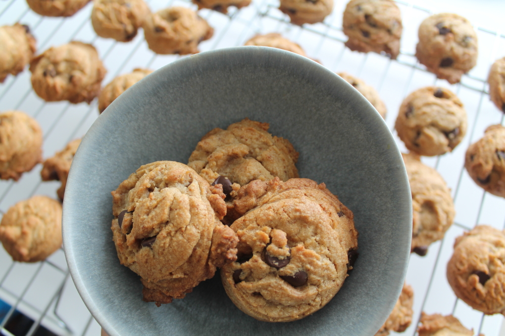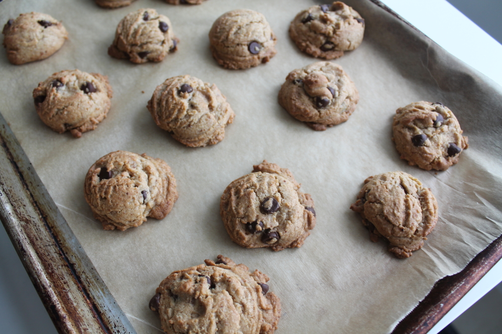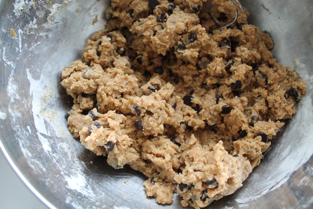 Here is yet another chocolate chip recipe. Can you tell I really like them? I decided to try this butter less cookie since my sister was trying to avoid dairy. I also wanted to try to use up items in my pantry and I had some coconut oil that I never really used too often. This recipe is quite simple and quick to make. For this recipe you will need coconut sugar or brown sugar, white sugar, eggs, vanilla, coconut oil, flour, vanilla extract and chocolate chips.
