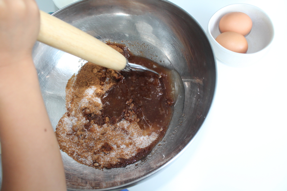 Start by mixing together the sugar and coconut oil.