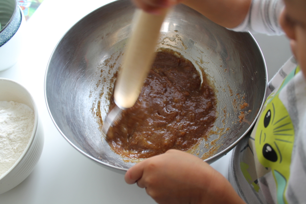 This is the best part for kids. They love mixing things together. Next I like to add the chocolate chips. I find that this helps to make them mix evenly.
