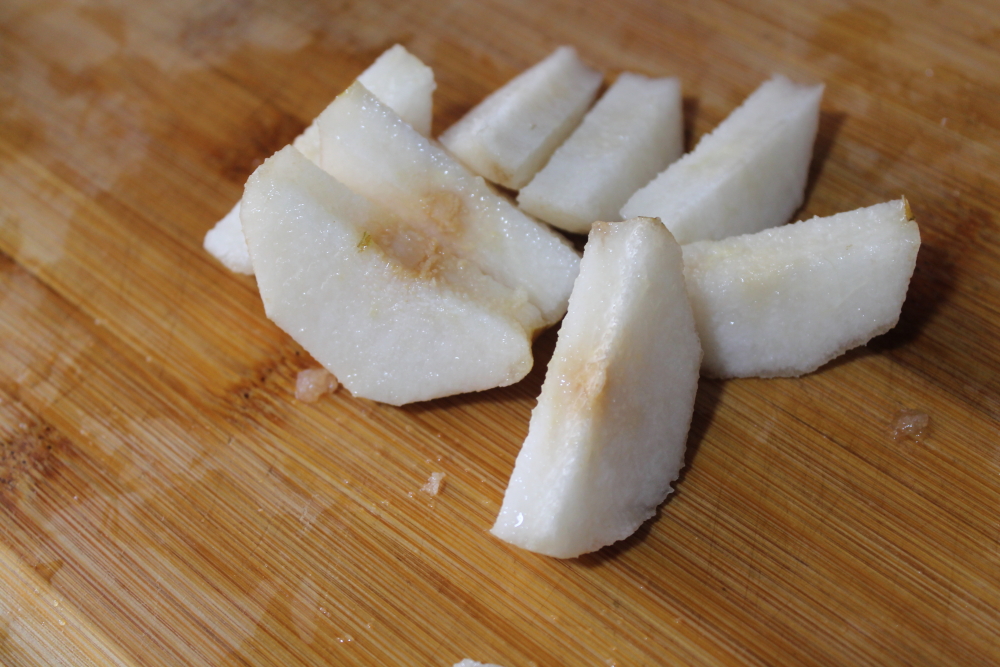 Prep the glass jar that you will be using to store the pickled pears by sanitizing in some boiling water. Peel and dice the pears into bite sized pieces. Place in the jar.