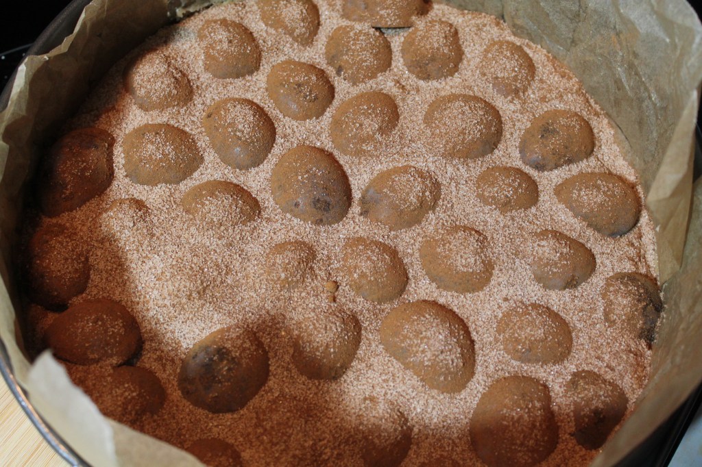 Mix together tbsp sugar and 2 tbsp cinnamon for the topping. Sprinkle the cinnamon and brown sugar mixture all over the top of the cake.