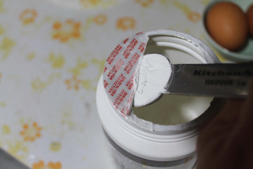 In a bowl, mix together the dry ingredients. I like to cut the tops of my baking powder into a straight edge so that I can get perfect teaspoons.
