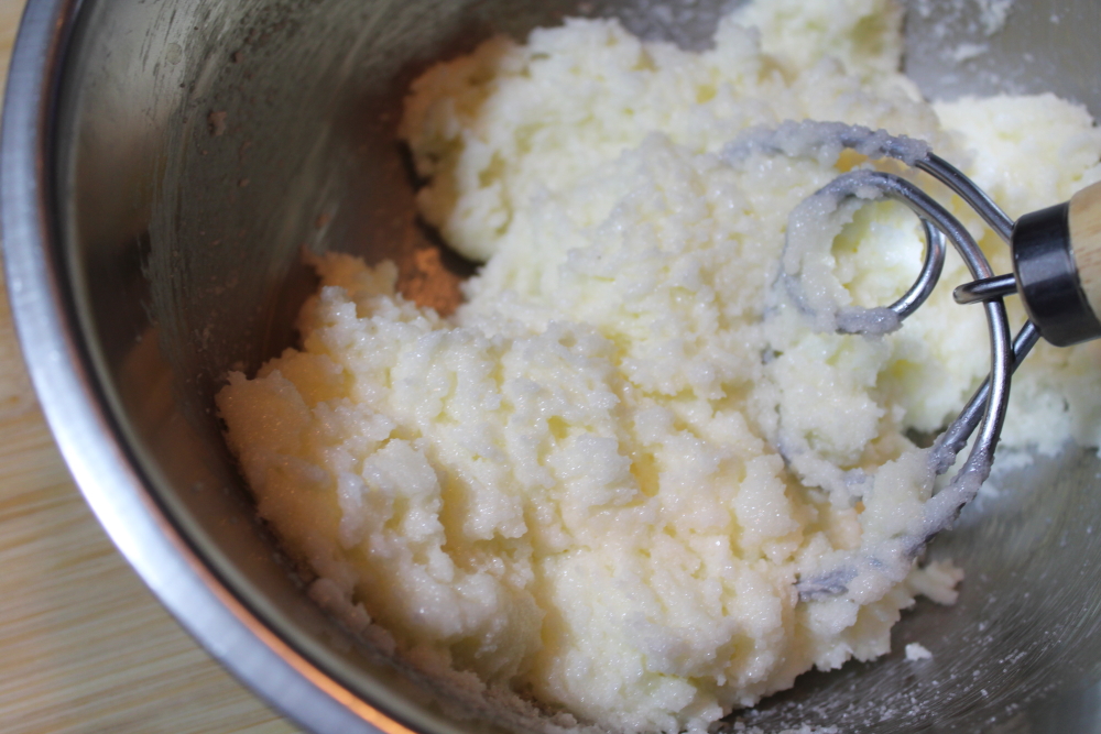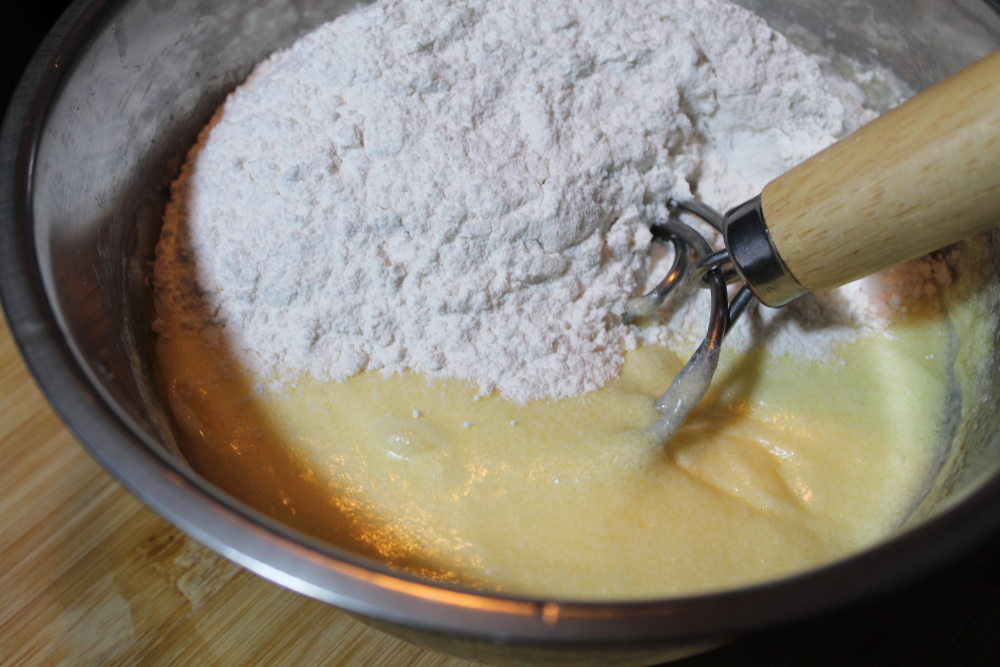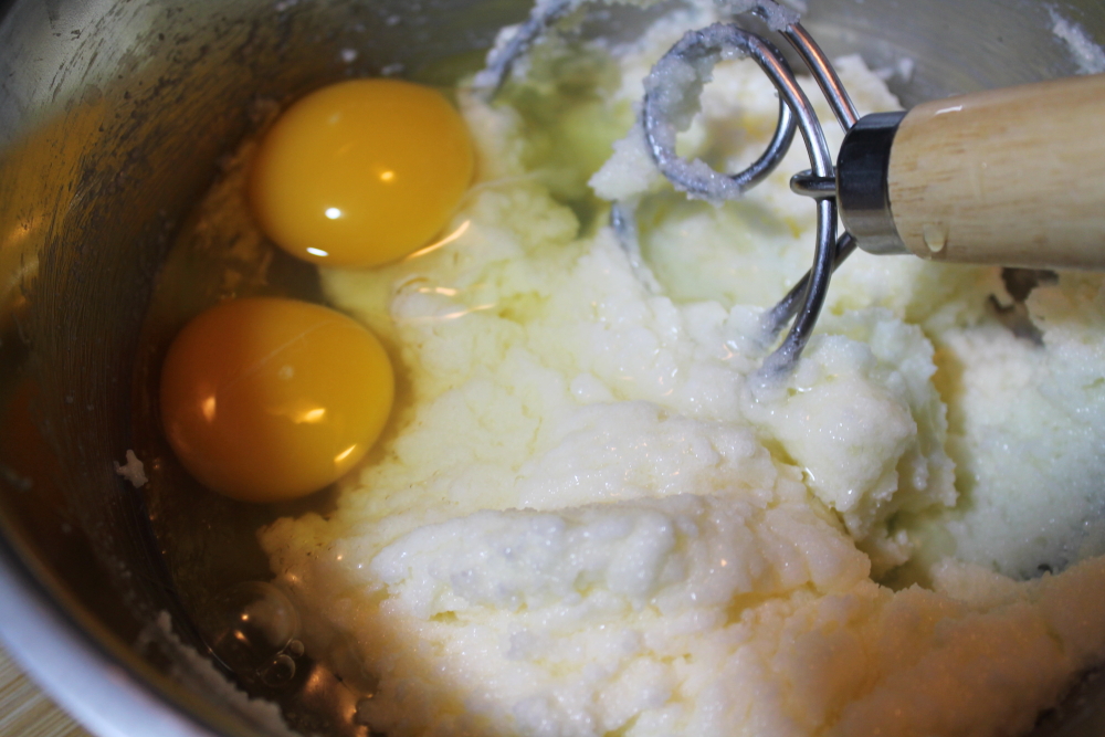 In a mixing bowl, cream together the sugar and butter. Add the eggs one at a time and mix. Slowly mix in the flour.