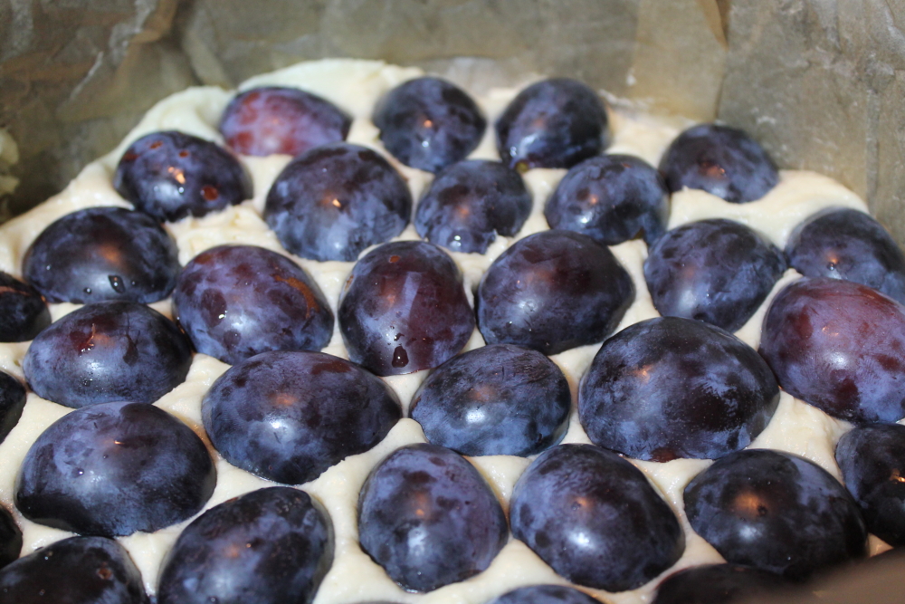 Butter and flour a 9 inch baking pan. You can add a layer of parchment paper to help remove it easily. Pour the batter into the pan. Layer the plums cut side down. Press down lightly.