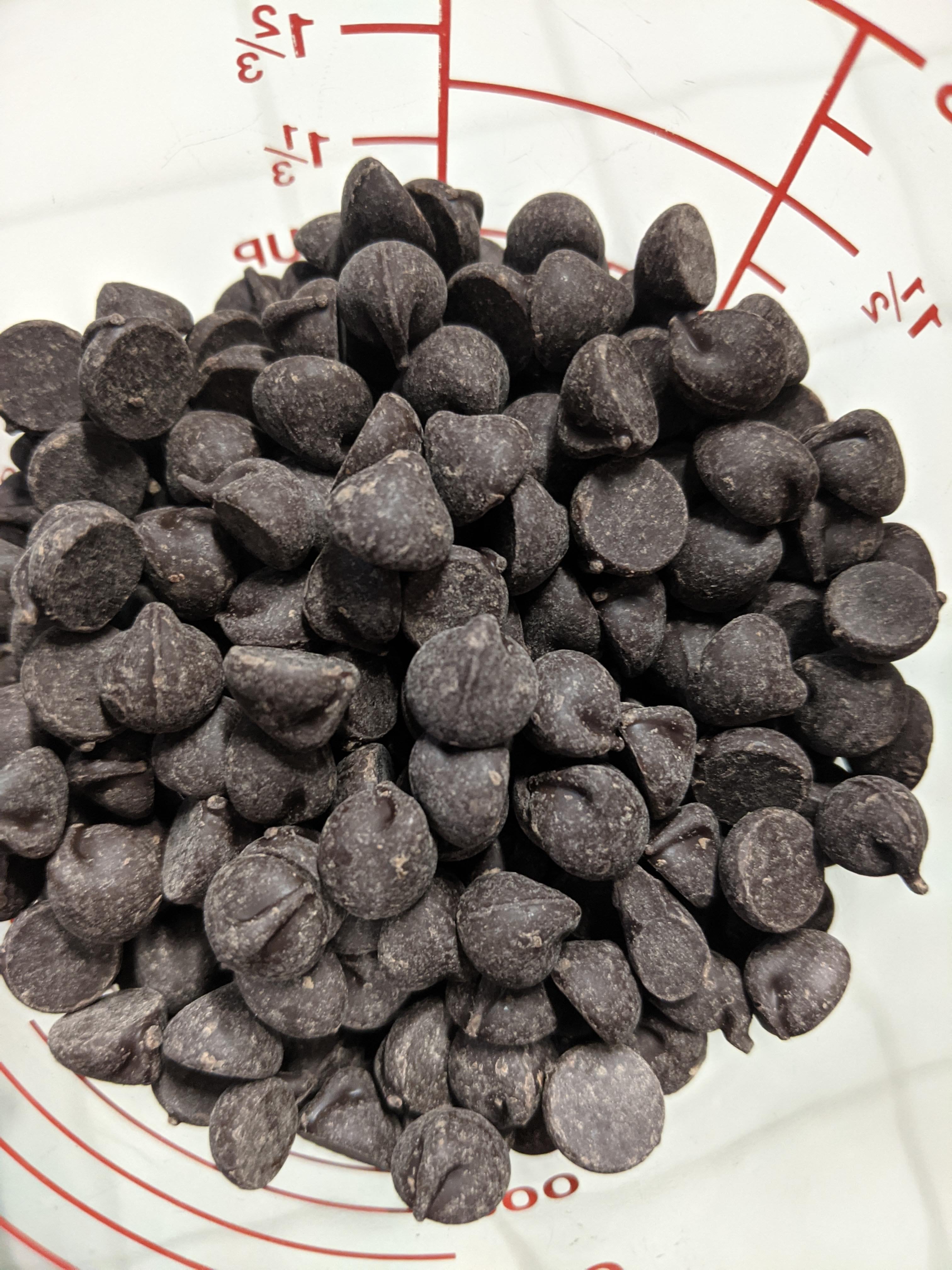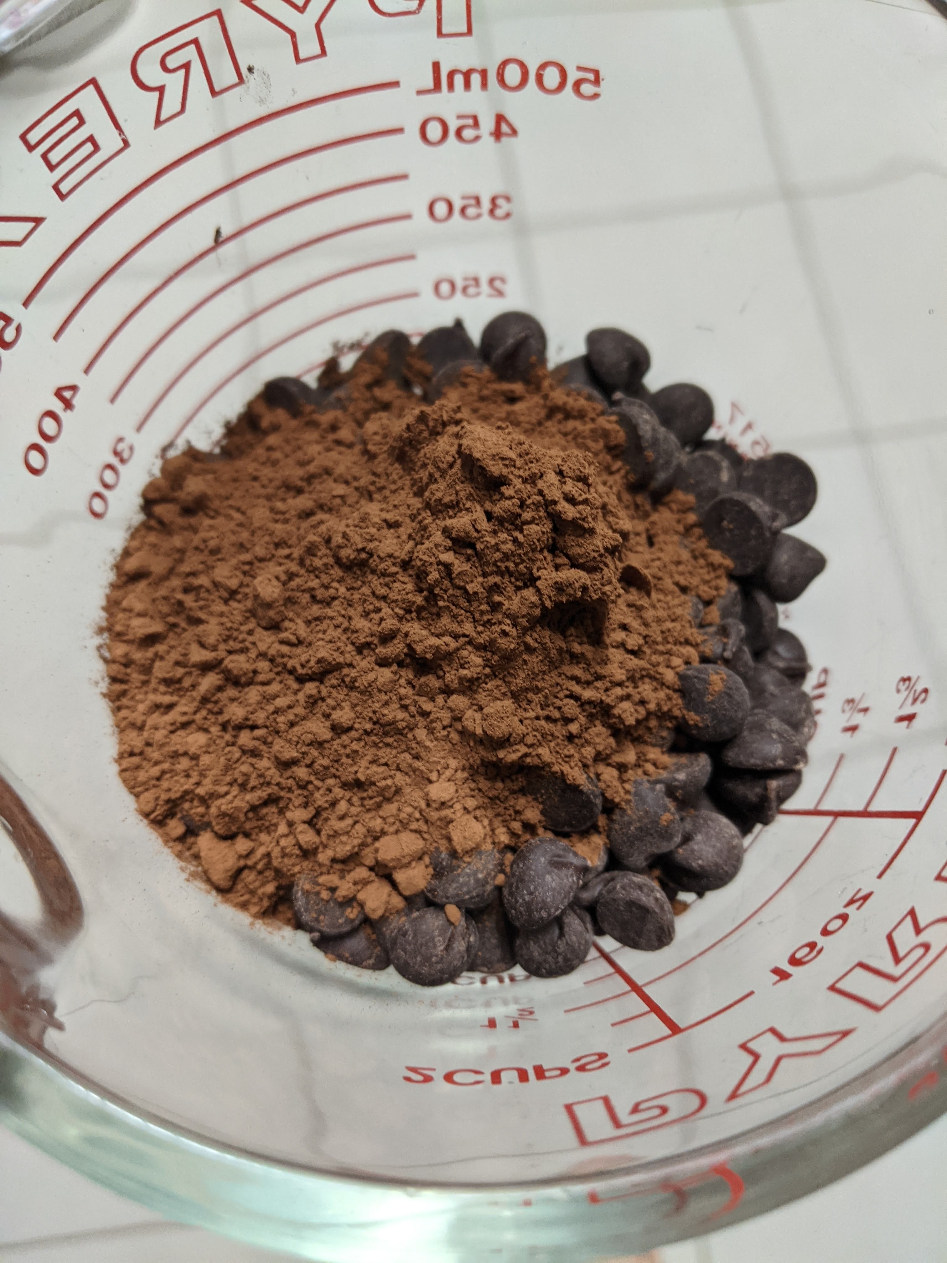 - When the marshmallows are melted, turn off the heat and add 1 cup of dark chocolate chips and 1/4 cup cocoa powder. Stir until well mixed.