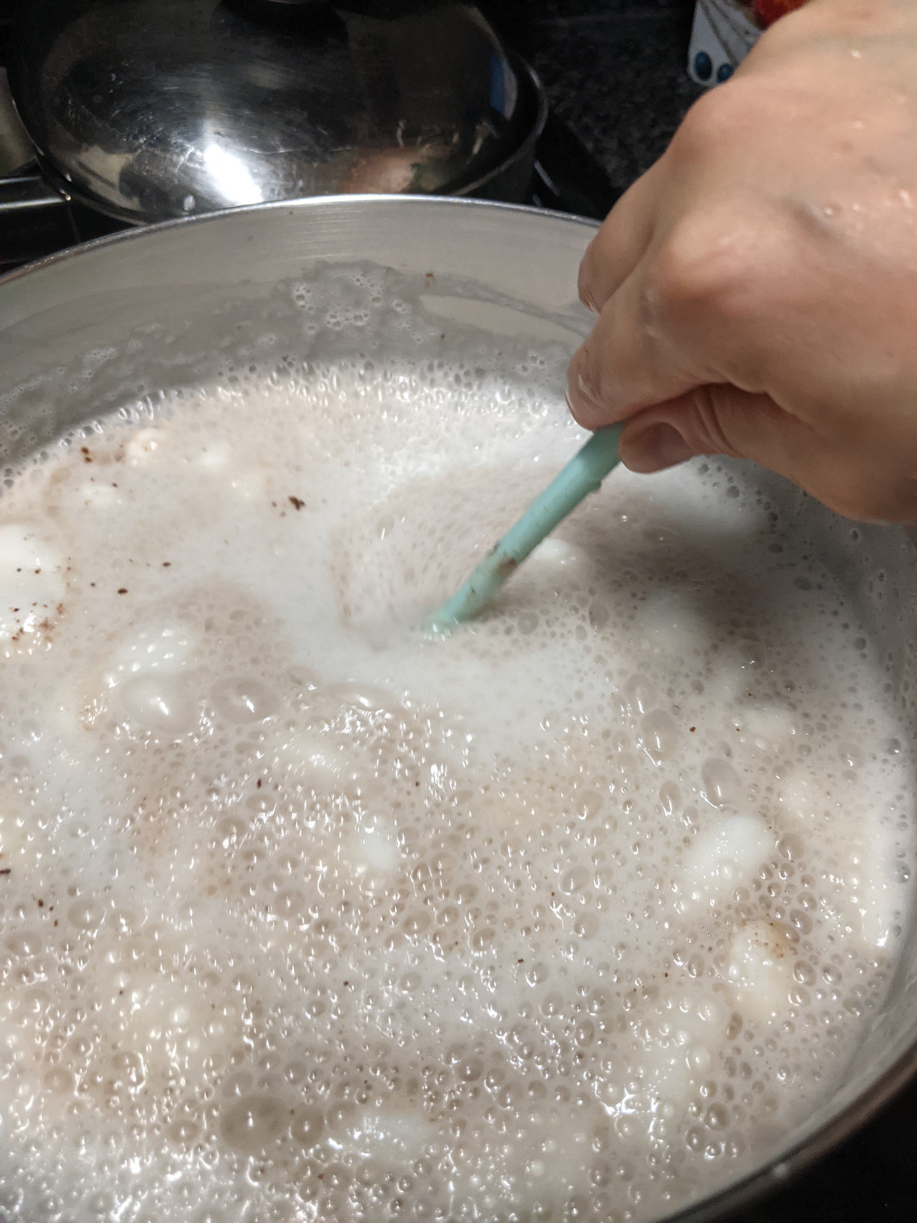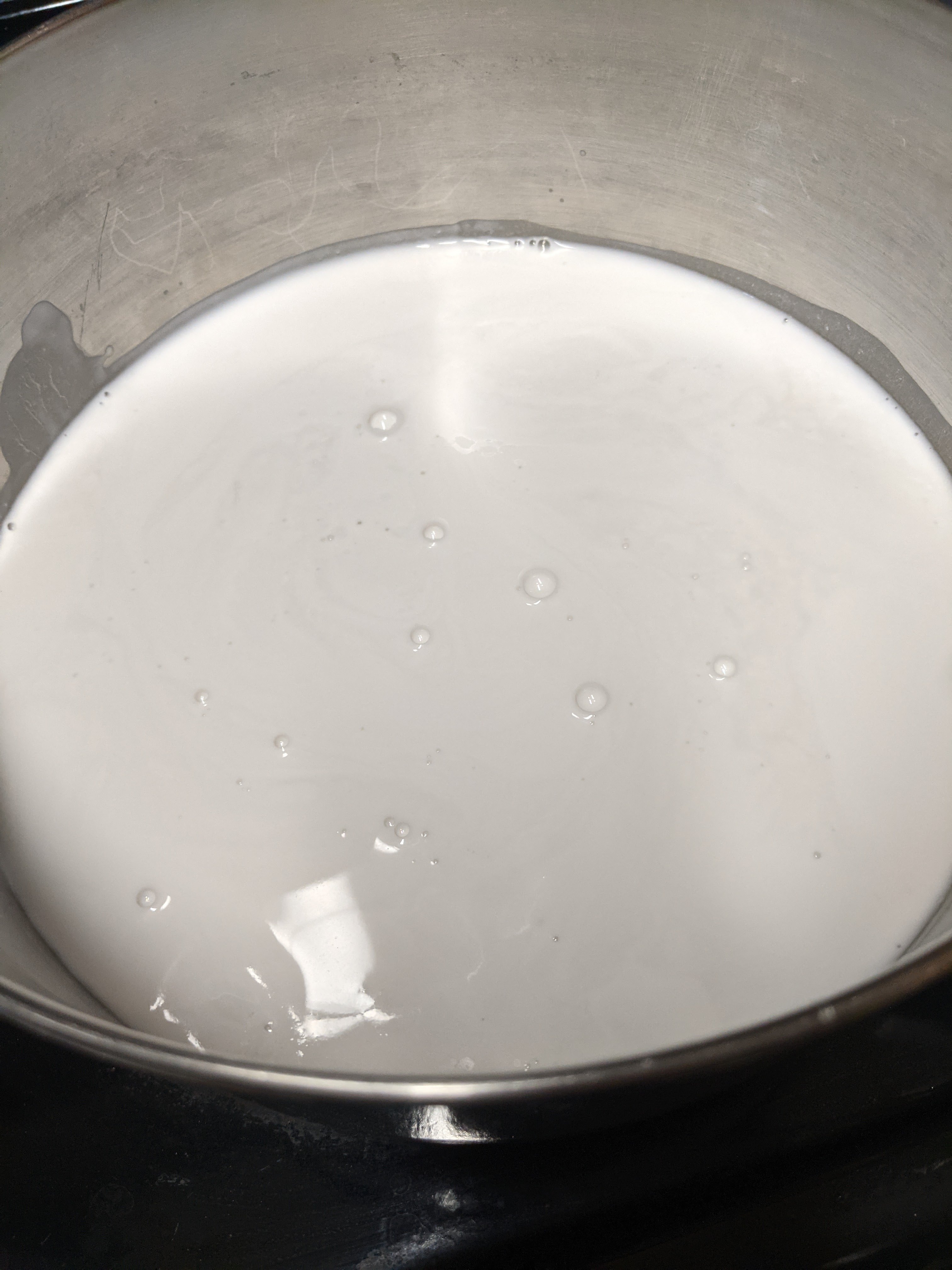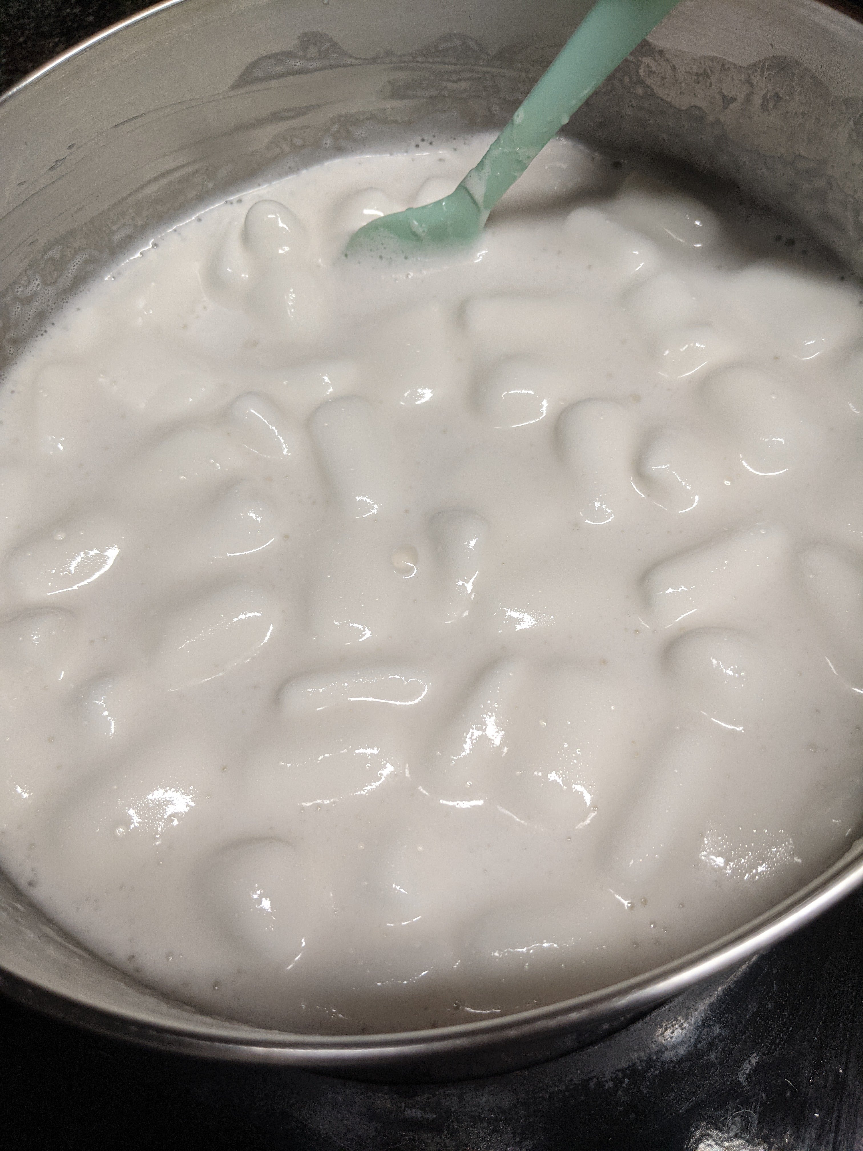 In a large pot, add 1 can coconut milk. On medium heat, heat up the coconut milk and then add the marshmallows. I used an entire bag of large marshmallows. Small marshmallows would work as well and mini marshmallows would melt a lot faster. Stir the marshmallows until they are completely melted.